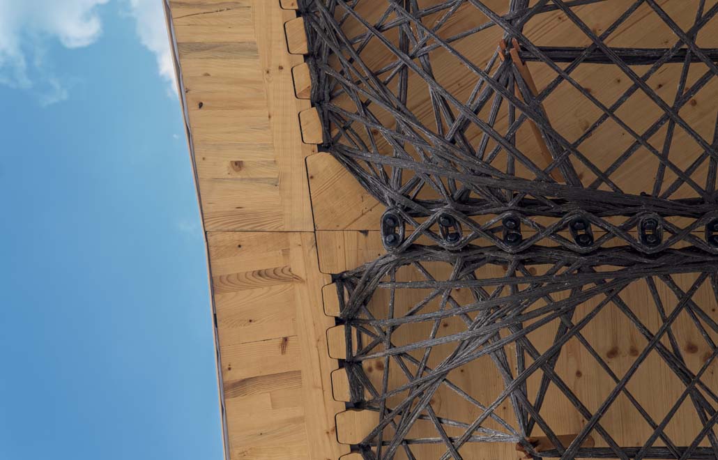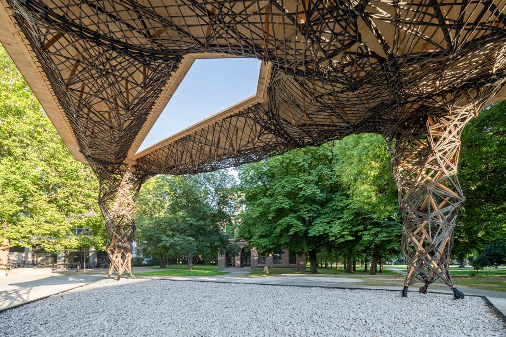 Mit einer vertrauten architektonischen Typologie entfaltet sich das einzigartige Hybridsystem des Pavillons als komplexes Zusammenspiel der Materialien. Das System erkundet einen erweiterten Gestaltungsraum für Faserstrukturen, der durch die strategische räumliche Anordnung beider Materialien ermöglicht wird. Es widerspricht konventionellen Vorstellungen von Form und Struktur und schafft eine neuartige, zugleich fundierte Material- und Architekturerfahrung.