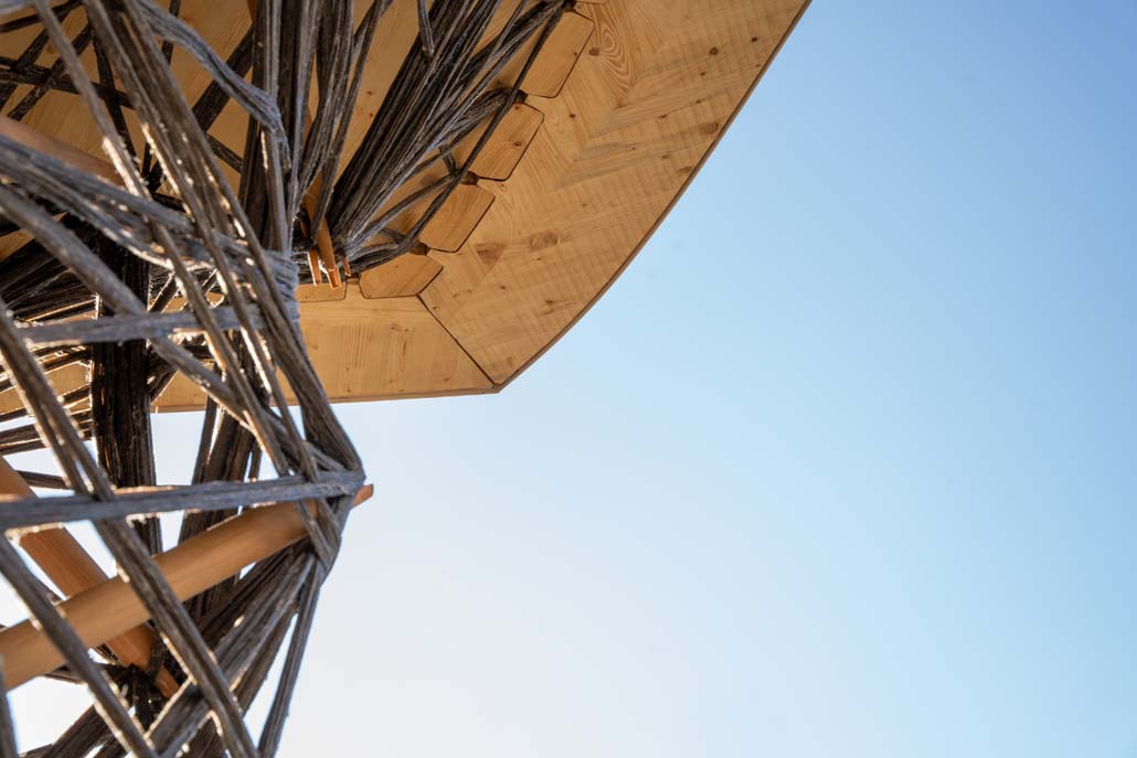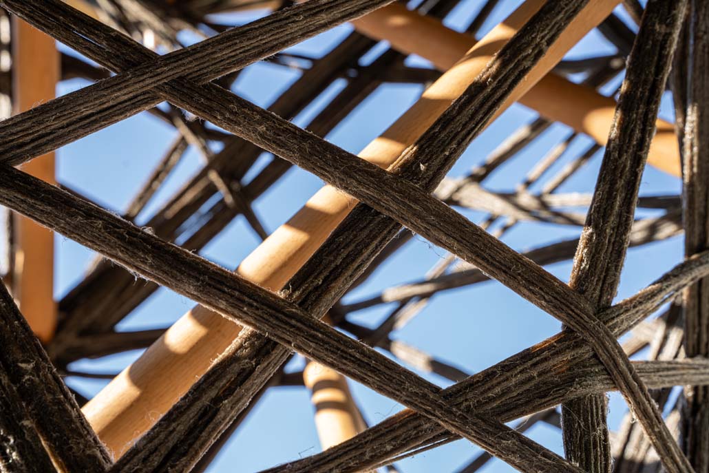Strukturell kombiniert das System die Druckfestigkeit des Holzes mit der Zugfestigkeit der Fasern, was die Materialverteilung sowie die geometrische Anordnung im gesamten System bestimmt. Die finale räumliche Konfiguration von Holz und Fasern verdeutlicht die Kräfteverteilung und zeigt das ständige Zusammenspiel der beiden Materialien. Dabei entstehen Synergien, die die strukturelle Leistung optimieren und das Potenzial beider Materialien voll ausschöpfen.