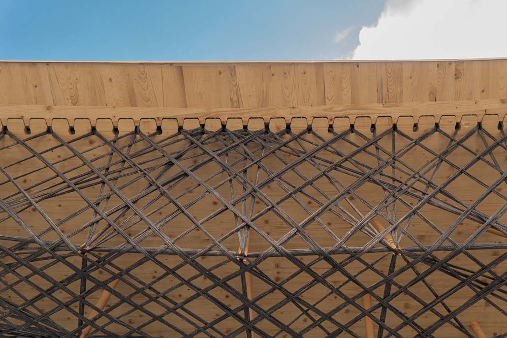 Die volumetrischen Eigenschaften von Holz werden in diesem Projekt als Dachelemente genutzt, um eine räumliche Hülle zu schaffen. Durch die einfache Bearbeitbarkeit des Holzes können die Plattenkanten gefräst werden, dass sie als Schnittstelle für die Fasern dienen. Im Gegensatz zum traditionellen kernlosen Faserwicklungsprozess, bei dem die Fasern um Wickelankerpunkte gelegt werden, die an einem temporären Stahlrahmen befestigt sind, übernimmt hier das Holz die Funktion des Rahmens. Es wird nicht nur temporär verwendet, sondern bleibt als integraler Bestandteil der Struktur erhalten.