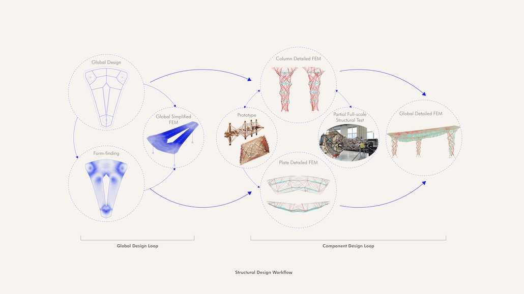Die endgültige Geometrie wurde so optimiert, dass sie den idealen Faserverlauf des Holzes und die gewünschten Spannweiten berücksichtigt. Dies führte zu drei Säulenkomponenten sowie zu zwei zweifach und drei einseitig gespannten Deckenelementen. Diese Komponenten übertragen die Kräfte effektiv durch den Querschnitt des Hybridsystems, erfüllen die Randbedingungen des Fertigungsprozesses und treffen in einem maximalen Winkel von zehn Grad aufeinander, um die Ableitung von Regenwasser zu gewährleisten.