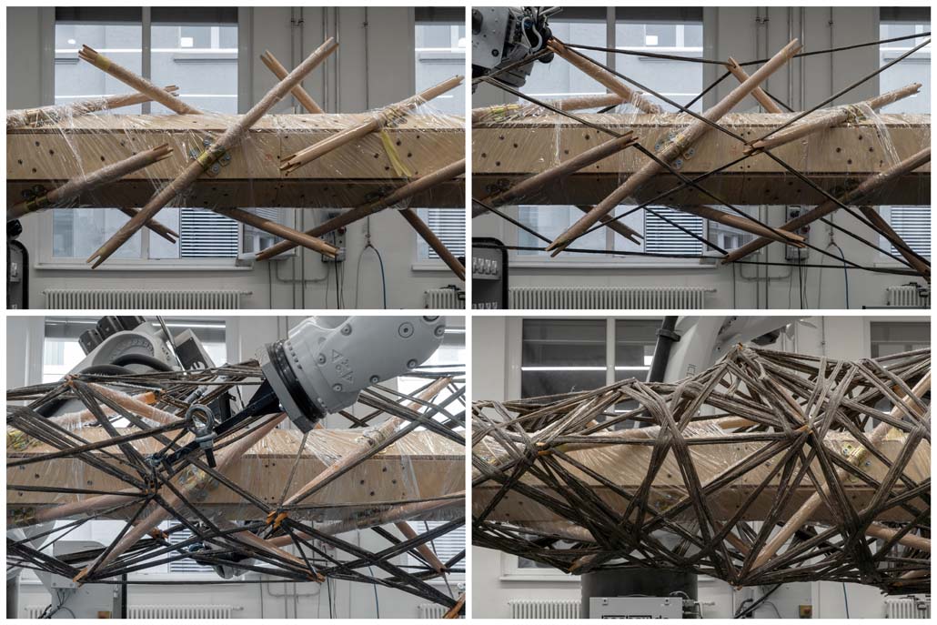 Dieses Projekt nutzt eine Multi-Roboter-Kollaboration, um die Anforderungen zu bewältigen, die sich aus der Verwendung von Holz als eingebetteten Rahmen ergeben. Insbesondere bei den Säulenelemente kommen schlanke Holzstreben zum Einsatz, die als Träger für die Fasern dienen und bei ungleichmäßiger Spannung brechen könnten. Um dieses Problem zu lösen, wird eine duale Anordnung von zwei Robotern eingesetzt, die gleichzeitig auf gegenüberliegenden Seiten derselben Strebe arbeiten. Diese Strategie wird insbesondere bei den ersten Wickelschichten angewendet, bis alle Streben gleichmäßig mit Fasern umwickelt und gesichert sind. Damit markiert dieses Projekt den ersten Einsatz einer parallelen Faserwickelstrategie zur Herstellung einer Struktur im Vollmaßstab.