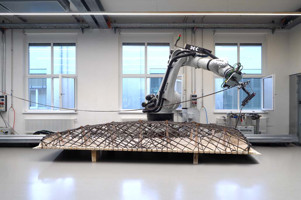 Aufgrund der einfacheren Geometrie der Deckenelemente und der Tatsache, dass die Streben nur auf einer Seite der Platten fixiert waren, kam für die Herstellung aller fünf Deckenelemente ein einzelnes Robotersystem zum Einsatz.