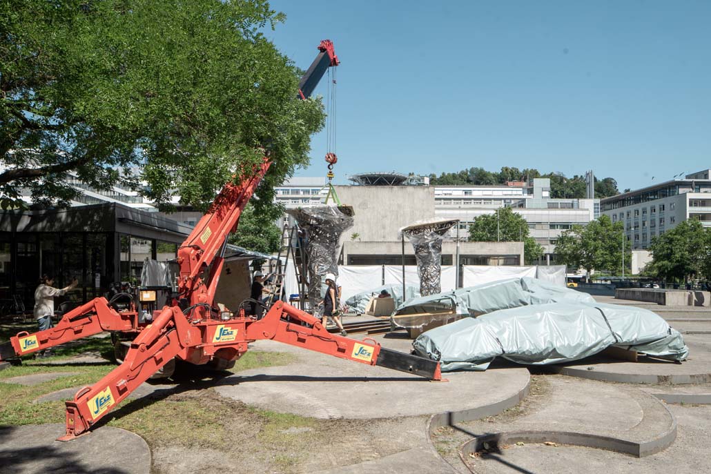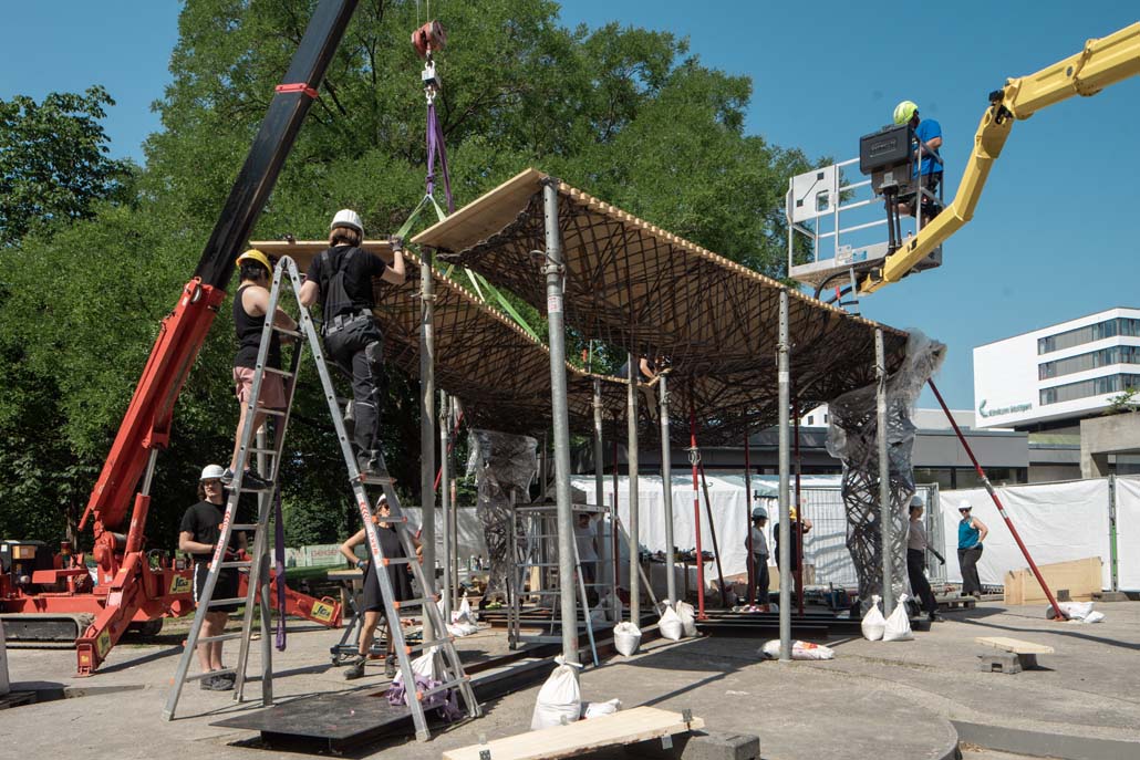 Nach der Fertigung wurde eine Testmontage des Pavillons im Maßstab 1:1 im Computational Construction Lab (CCL) durchgeführt, bei der die Struktur kopfüber aufgebaut wurde, um Fertigungstoleranzen zu überprüfen. Dieser Prozess ermöglichte zudem das Wickeln der abnehmbaren Fasernähte, bevor die Komponenten zur Baustelle transportiert wurden.