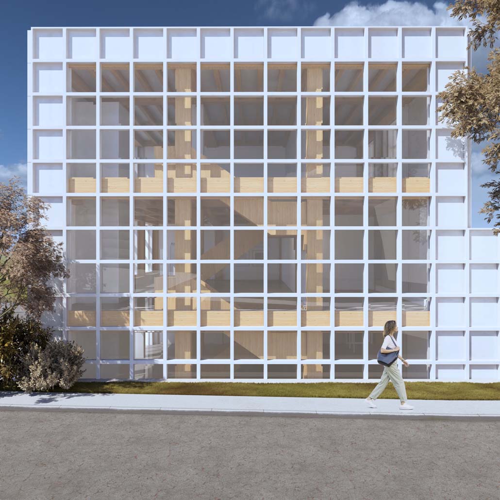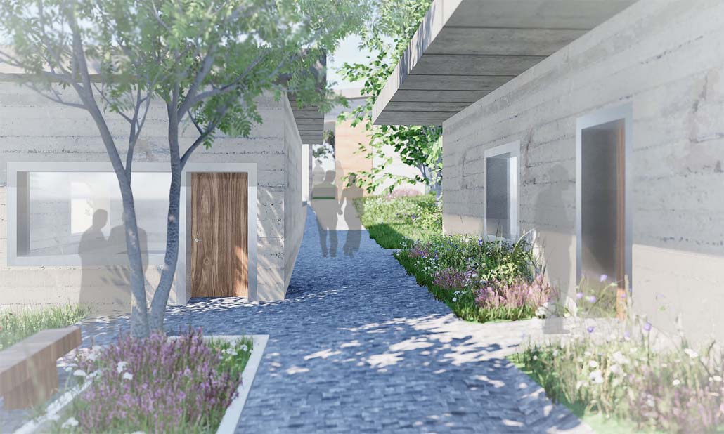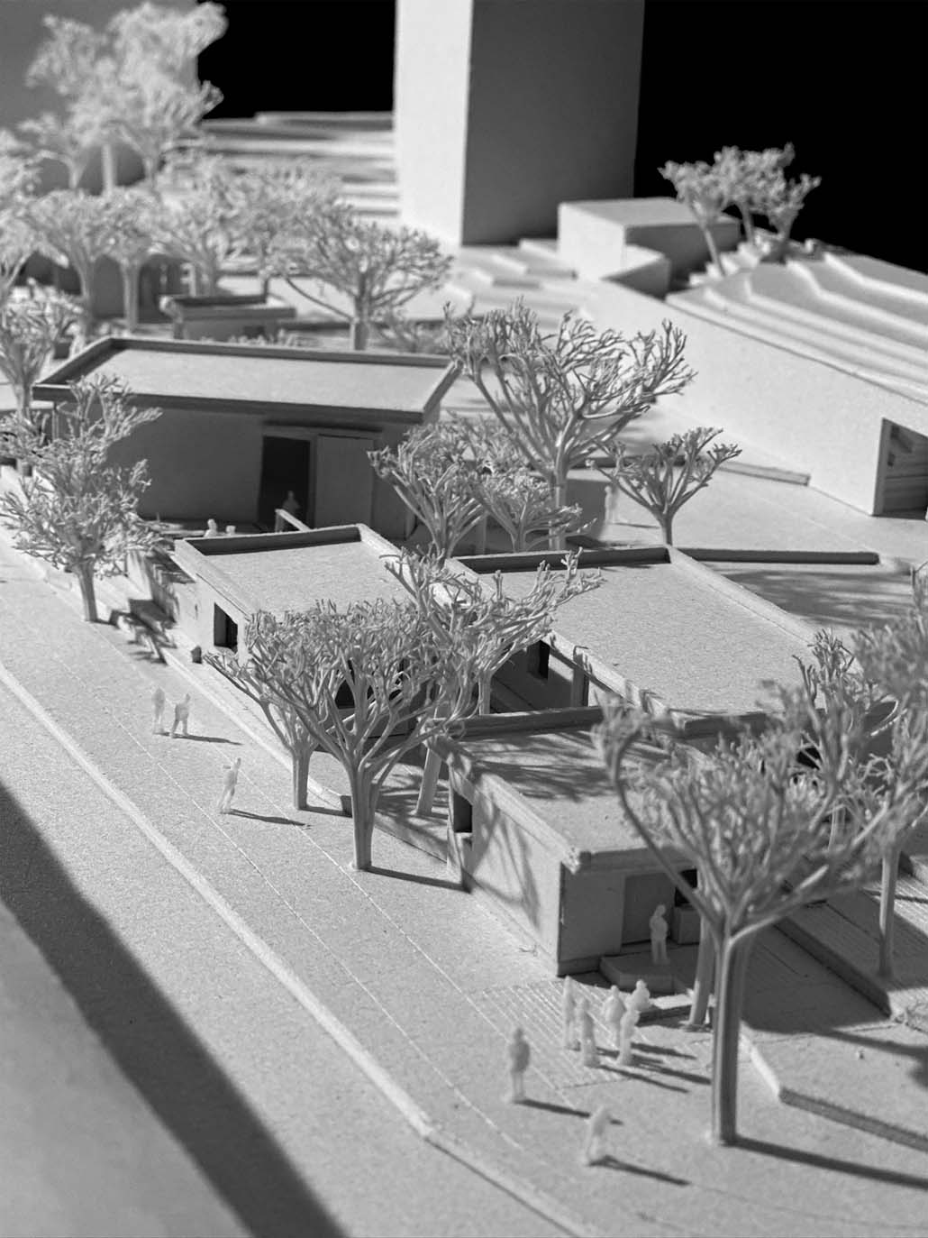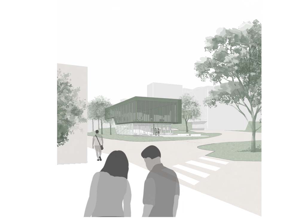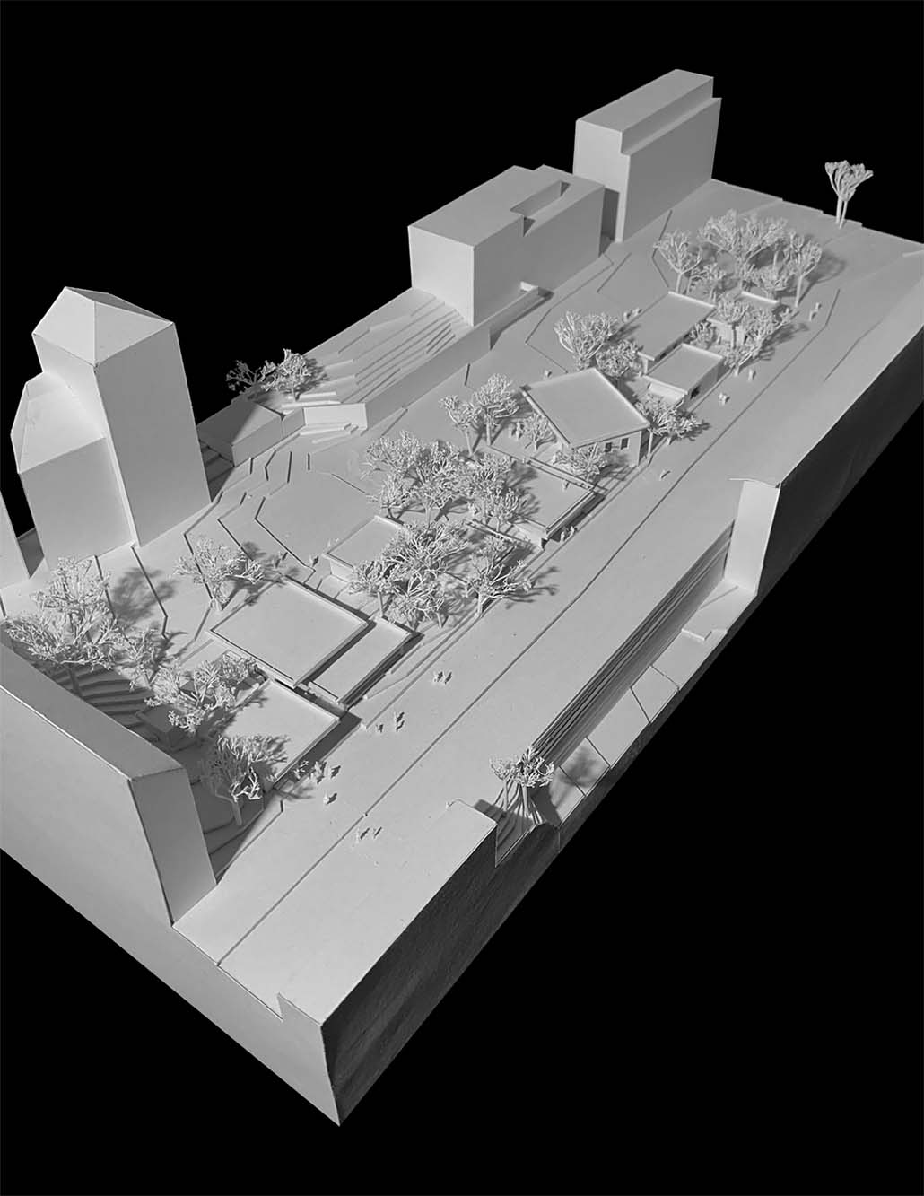 Die vorliegende städtebauliche Situation befindet sich an der Nahtstelle zwischen Wohnbau und Kulturmeile. Die Körnung des neu beplanten Bereichs orientiert sich an der Wohnbebauung im nördlichen Teil und erstreckt sich bis in den Kulturbereich im Süden. Da es sich bei dem Neubau um eine Mischform aus Wohnen und Kultur handelt, wurde eine Wohnbautypische Körnung gewählt, um den Charakter einer Ausstellung in einer Wohnbebauung wieder aufzunehmen.