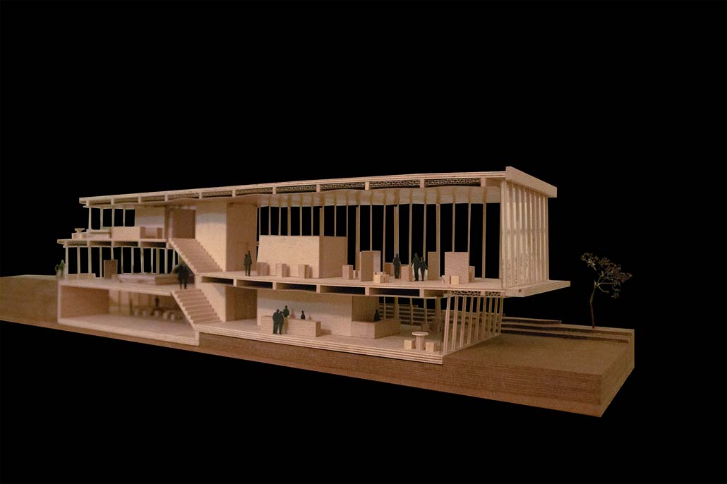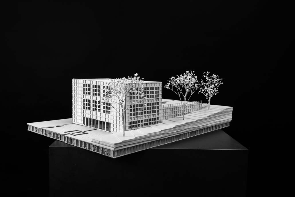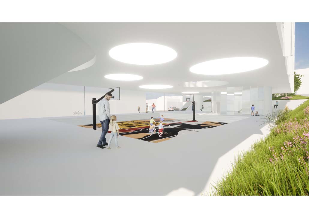 Das Café öffnet sich zur Terrasse. Glas, Stahl, Beton – eine klare Komposition. Der Blick schweift in den Skulpturengarten, der Teil der Architektur wird. Licht und Schatten, Material und Natur treten in Dialog. Der Raum bleibt offen, flexibel, anpassbar. Die Werkstatt ist ein funktionaler Raum. Hier wird gearbeitet, entworfen, gefertigt. Architekturstudenten und Handwerker finden eine einfache, gut durchdachte Umgebung. Angrenzend das Archiv – eine stille Ordnung für das Bewahren. Im oberen Geschoss liegt das Büro. Klare Linien, klare Funktion: Arbeitsplätze, Besprechungsbereich, Rückzugsmöglichkeiten. Der Direktor lebt im Haus – in einer lichtdurchfluteten Wohnung, offen und strukturiert, frei von Überfluss. Im Erdgeschoss findet sich Raum für Bewegung, für die Jugend. Ein klar definierter Hof – ein Basketballcourt, ein Ort der Aktivität. Architektur als Rahmen für das Leben. Das Haus der Architektur ist Reduktion. Kein Ornament, keine Ablenkung. Struktur, Material, Raum – „Less is more.“