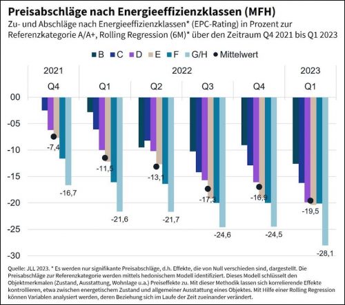 Frankfurt (pm) – Die Preisschere zwischen energieeffizienten Wohnimmobilien und Gebäuden mit schlechter Energiebilanz öffnet sich weiter. Im ersten Quartal 2023 lagen die Angebotspreise für Mehrfamilienhäuser der schlechtesten Energieklassen G und H im Durchschnitt rund 28 Prozent unter denen der besten Energieklassen (A/A+). Ein Jahr zuvor betrug der Unterschied dagegen nur 21,6 Prozent. Das hat eine Analyse von JLL ergeben, für die rund 5.000 Angebotsdaten von Mehrfamilienhäusern ausgewertet wurden.