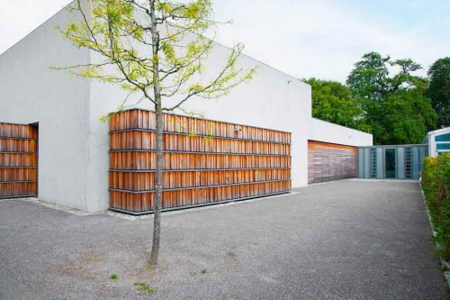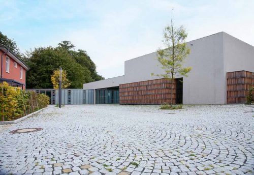 Das aufs Wesentliche reduzierte schlichte Bauwerk ist durch drei sich nach außen schiebende hölzerne Kuben geprägt. Die Anordnung der hölzernen Lamellen assoziiert schon von Weitem Bücherregale. Im