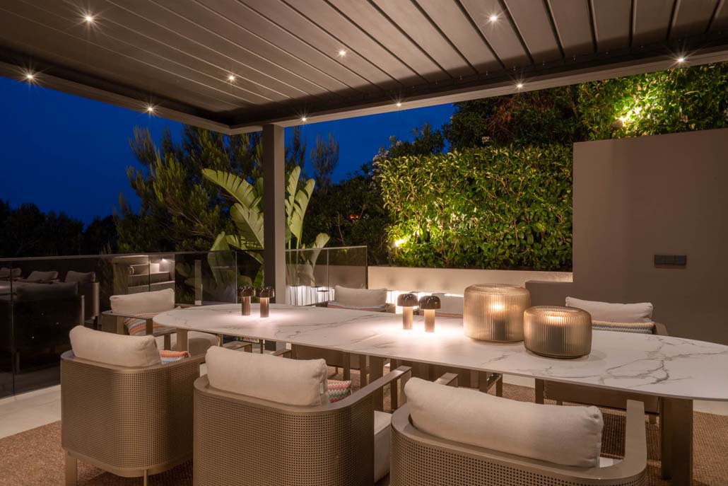 Hoch oben in malerischer Hanglage und mit Blick auf die Insel-Metropole liegt das Haus in einer angestammten Wohnsiedlung. Aufgrund seiner Hanglage ist es in vier Ebenen gegliedert, auf die sich die einzelnen Räume verteilen: An die offene Küche und das Ess- und Wohnzimmer schließt sich eine Veranda an, die mit einem großen Tisch für viele Gäste und gepolsterten Sitzmöbeln wie ein zweites Wohnzimmer wirkt. Infinitypool, Sonnenliegen, ein offener Feuerplatz und eine Außenküche unter einem Lamellendach schaffen noch mehr Platz und Möglichkeiten für ein Leben im Freien. Licht und großzügig, dennoch gut geschützt vor der balearischen Sonne. „Das gesamte Objekt ist sehr nach außen gerichtet“, sagt Viki Kitzig, Geschäftsführerin von Kitzig Interior Design. Große Panormafenster weiten die Räume, lenken den Blick nach draußen und fangen so das Lebensgefühl von Ibiza ein.