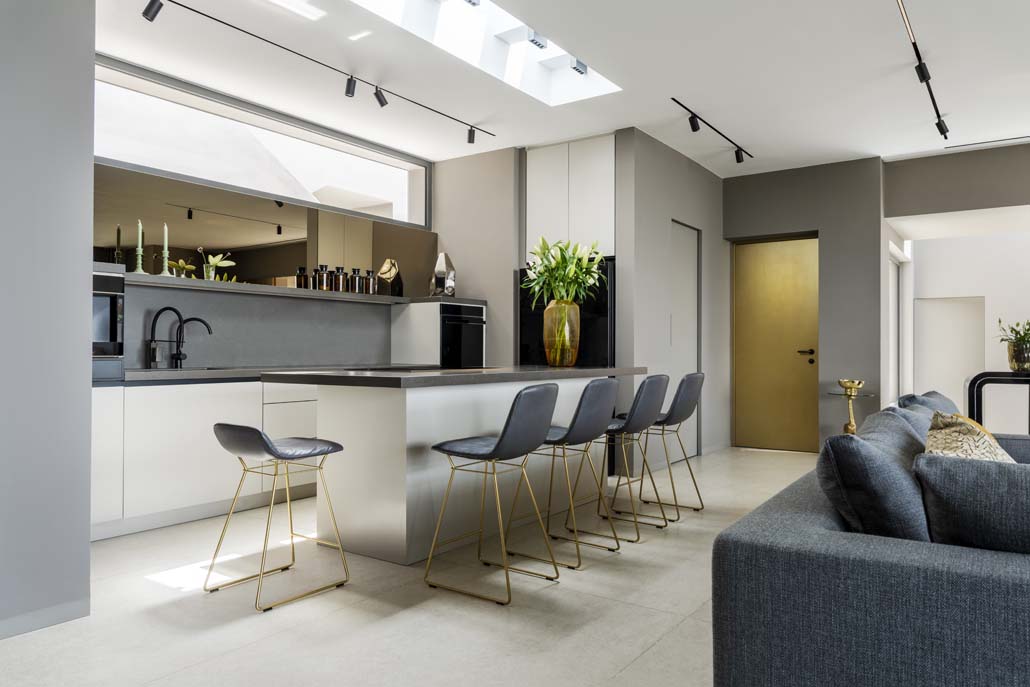 Neben dem Masterschlafzimmer mit angeschlossenem Bad und zwei weiteren Schlafzimmern entstand zudem ein komplettes Appartement, das speziell für die Unterbringung von Gästen gestaltet wurde. Allen gemein – eine einladende, großzügigen Luxus ausstrahlende Atmosphäre. Hochwertige, großformatige Feinsteinplatten wurden innen wie außen im gesamten Haus verlegt, zahlreiche Möbel aus Nussbaum maßgefertigt, ein flächenbündiges Lichtsystem installiert. Entsprechend der warmen Farbgebung wählte Viki Kitzig Taupe in zwei Abstufungen als Wandfarbe – für alle Innen- wie Außenwände. Auch für einzelne Möbel, die im selben Farbton matt lackiert wurden.