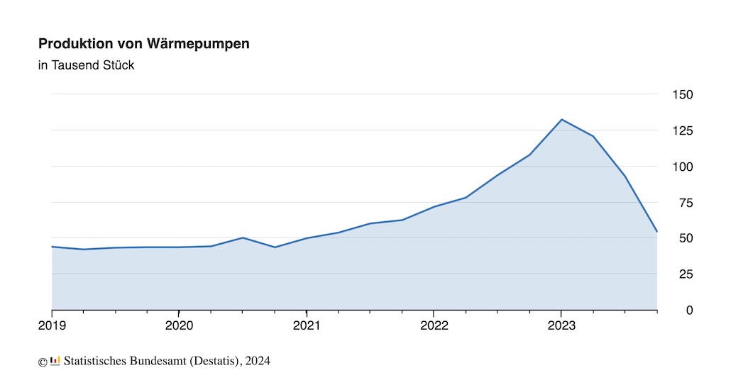 Auch beim Export von Wärmepumpen ist eine ähnliche Entwicklung zu sehen. So wurden im Jahr 2023 Wärmepumpen im Wert von 802,5 Millionen Euro exportiert, ein Anstieg um 3,2 % gegenüber dem Vorjahr. Im 1. Quartal 2024 wurden dann Wärmepumpen im Wert von 117,5 Millionen Euro aus Deutschland ausgeführt – das waren 7,6 % weniger als im Vorquartal (127,2 Millionen Euro) und 52,0 % weniger als im 1. Quartal 2023 (244,8 Millionen Euro).