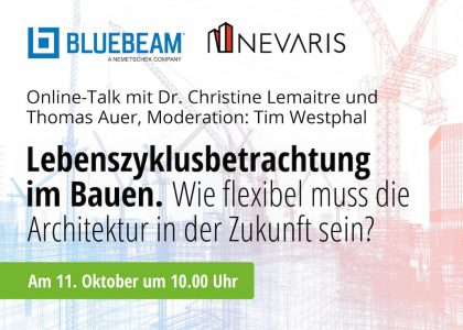 Diesen und weiteren wichtigen Fragen zu einer nachhaltigen, lebenszyklusorientierten Architektur möchten BLUEBEAM und NEVARIS, beides Unternehmen der Build-Division in der Nemetschek Group unter der Führung von Branchenexpertin Ruth Schiffmann, nachgehen. Den einstündigen Online-Talk mit Dr. Christine Lemaitre, geschäftsführender Vorstand der DGNB und Prof. Thomas Auer, Professor für Gebäudetechnologie und klimagerechtes Bauen an der TU München sowie Geschäftsleitung von Transsolar moderiert Tim Westphal, Baufachjournalist für Bausoftware, BIM und digitale Planungsmethoden.