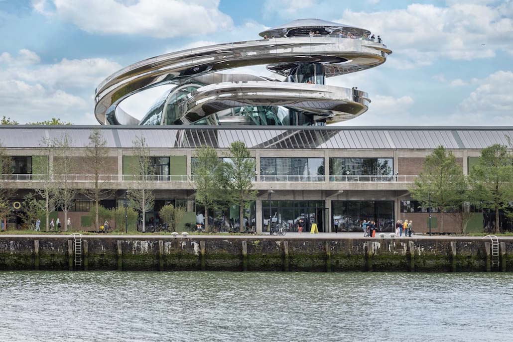 Lüdenscheidt (pm) – Mit dem Fenix Museum hat Rotterdam nicht nur ein weiteres architektonisches Wahrzeichen, sondern auch einen außergewöhnlichen Ort für Kunst und Erinnerung geschaffen. Das Kunst- und Kulturzentrum widmet sich der globalen Migrationsgeschichte. Es befindet sich auf Rotterdams Halbinsel Katendrecht in einem restaurierten Lagerhaus der Holland-Amerika-Linie aus dem Jahr 1923. Das vom chinesischen Architekturbüro MAD Architects entworfene Museum wird gekrönt von einer verspiegelten Doppelhelixtreppe mit Aussichtsplattform. Diese erhebt sich weithin sichtbar über das Gebäude und bietet einen Panoramablick über Stadt und Hafen. Die vielfältigen Ausstellungsbereiche des 2025 eröffneten Museums setzen ERCO LED Strahler perfekt in Szene.