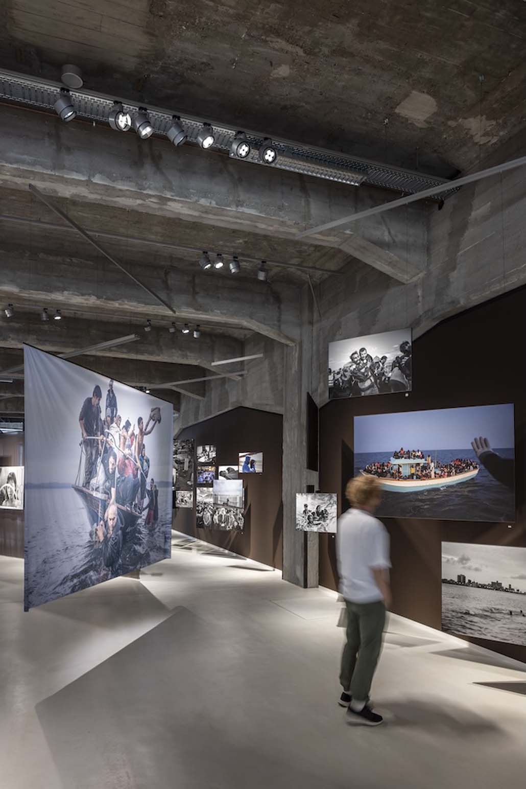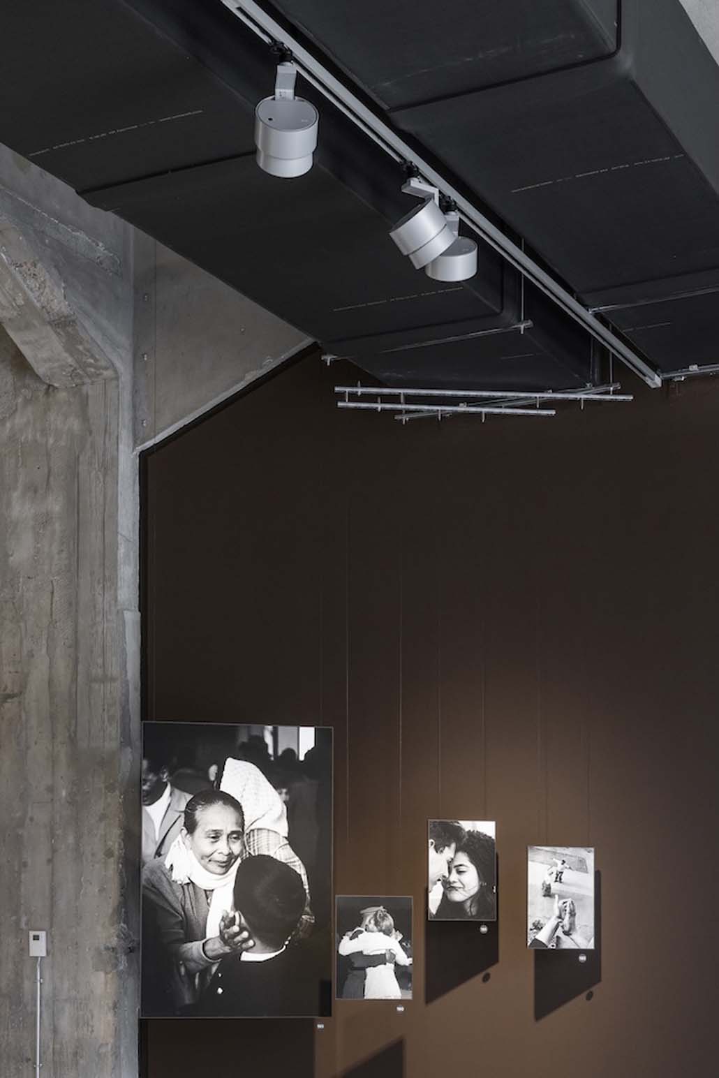 Im gegenüberliegenden Raum werden im Rahmen der aktuellen Ausstellung „The Family of Migrants“ fast 200 Schwarz-Weiß-Fotografien gezeigt. Die Bilder sind kreuz und quer im Raum verteilt und auf transparente Gaze gedruckt, somit jeweils von vorne und hinten zu betrachten. Auf eine Grundbeleuchtung wird hier verzichtet. Parscan Strahler mit Lichtverteilung spot und narrow spot beleuchten jedes einzelne Foto akzentuiert und wurden exakt ausgerichtet, um einen Schattenwurf auf die jeweils dahinter befindlichen Fotos zu vermeiden. „Die Herausforderung bei der Beleuchtung bestand darin, durch die Verwendung unterschiedlicher Lichtstärken ein Gleichgewicht zwischen den unterschiedlich großen und unterschiedlich hellen Bildern zu schaffen. Deshalb hat fast jedes Bild seinen eigenen Strahler bekommen”, erklärt die Lichtplanerin. „Wir haben uns nicht nur aufgrund der Individualisierungsmöglichkeit und der hohen Flexibilität für ERCO Strahler entschieden, sondern auch, weil sie leicht zu montieren und dabei sehr robust und langlebig sind.” Um neben den Energiekosten auch den Wartungsaufwand so gering wie möglich zu halten, ist Langlebigkeit im Museumsbetrieb ein entscheidender Faktor: ERCO Leuchten sind dank fortschrittlicher Technik, robuster Komponenten und eigenentwickelter Optoelektronik für den Langzeitbetrieb ausgelegt.