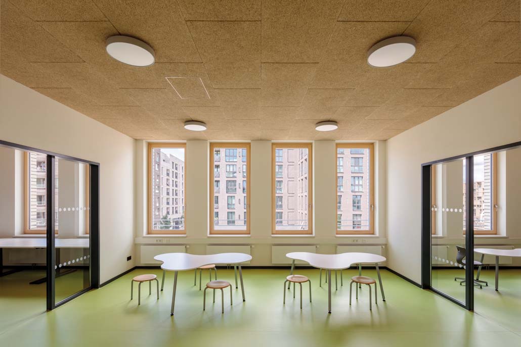 Mit dem Ziel, das HafenCity Umweltzeichen in Platin zu erlangen, demonstriert die Schule vorbildliche Nachhaltigkeitsprinzipien. Der Einsatz massiver Baustoffe verbessert nicht nur das Raumklima, sondern optimiert auch die thermische Speicherfähigkeit der Struktur. Alle verwendeten Materialien sind natürlich, langlebig und frei von zukünftig als schädlich eingestuften Substanzen.