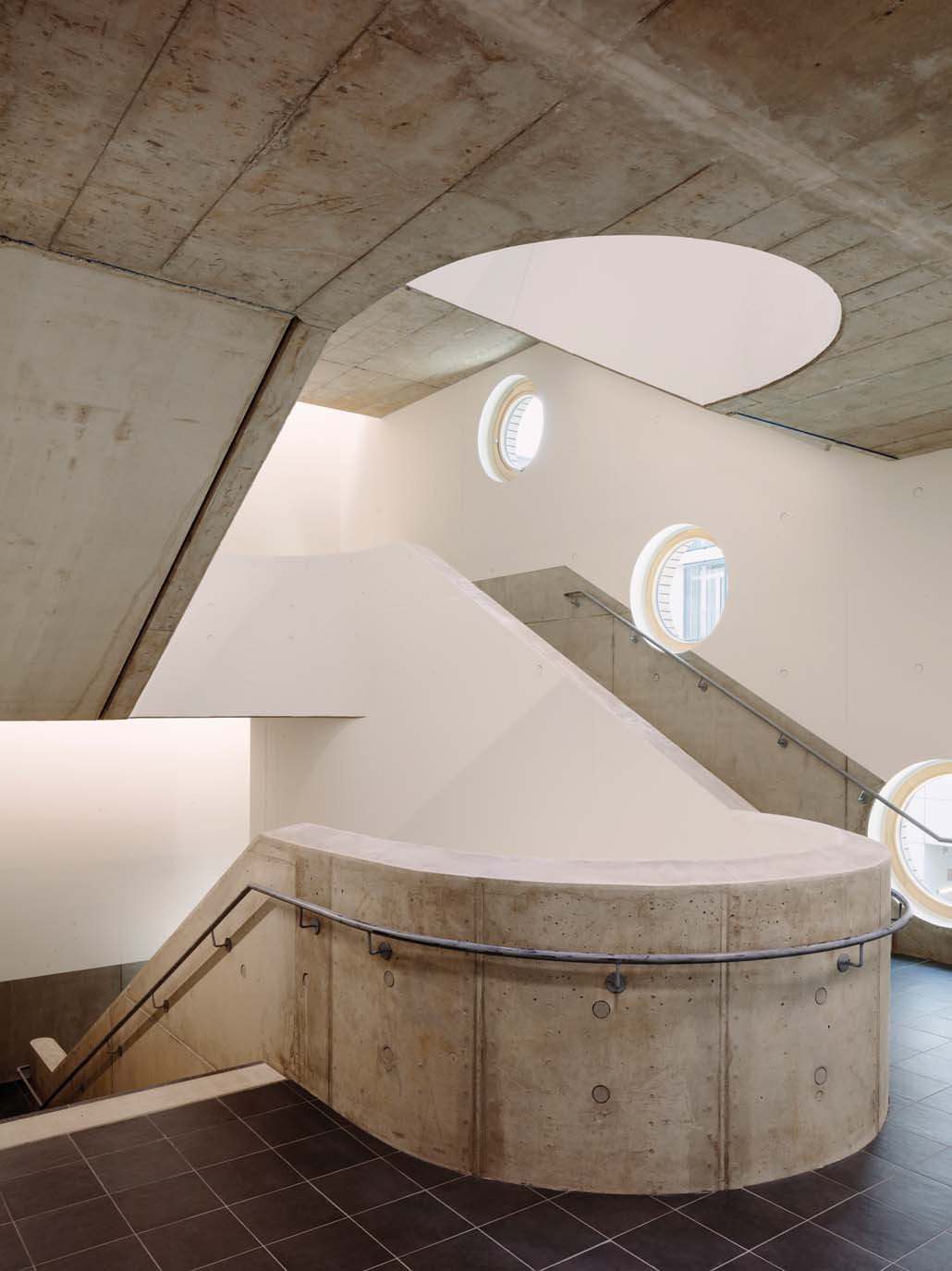 Die Schule, ausgelegt für 460 SchülerInnen, präsentiert sich mit einer wandelbaren, großzügig verglasten Gewerbefläche, aktuell genutzt als Infopoint der HafenCity GmbH. Mit einem diskret im Norden angelegten Hauptzugang, der sich entlang des Petersenkais erstreckt, wird eine nahtlose und barrierefreie Zugänglichkeit gewährleistet. Das avantgardistische Design einer vertikalen Schule spiegelt sich in der funktionalen Überlappung der verschiedenen Ebenen wider, einschließlich begrünter Pausenflächen auf den Dächern und einer zentral gelegenen Bibliothek, die die Kommunikation fördert und beeindruckende Aussichten eröffnet.