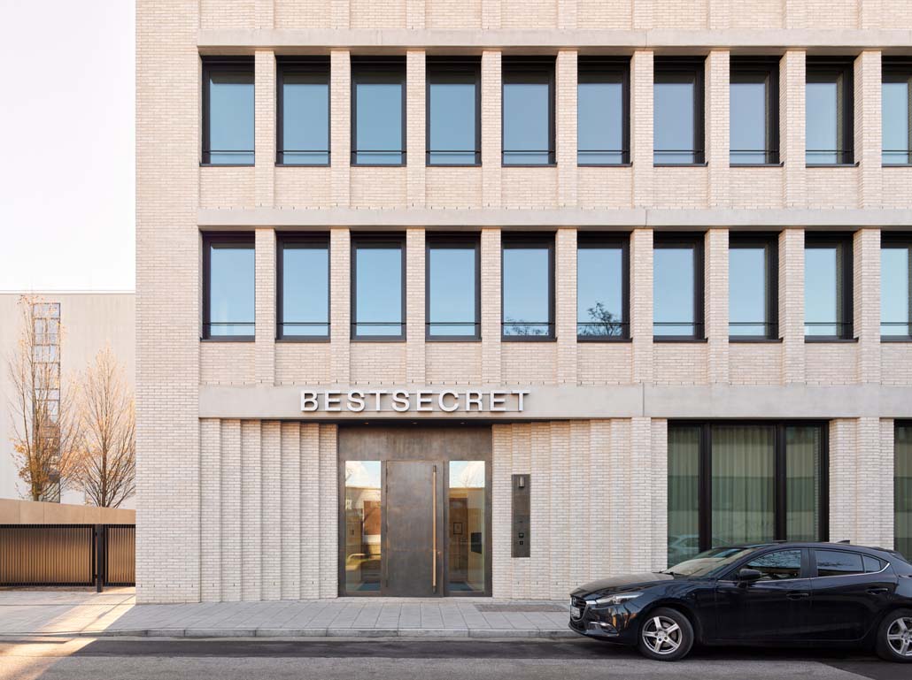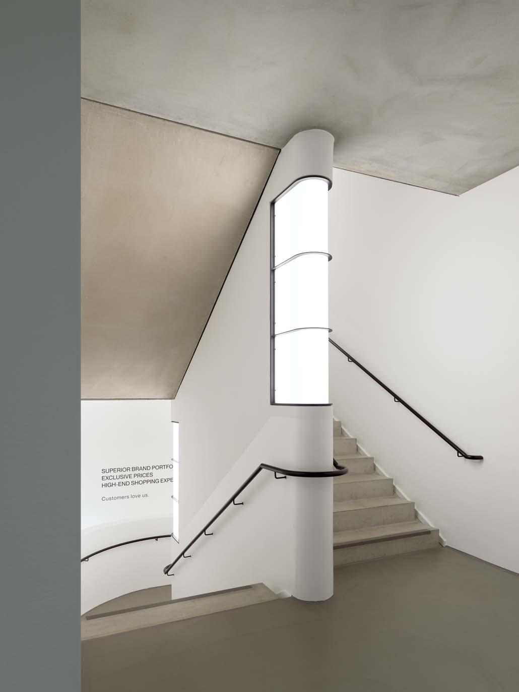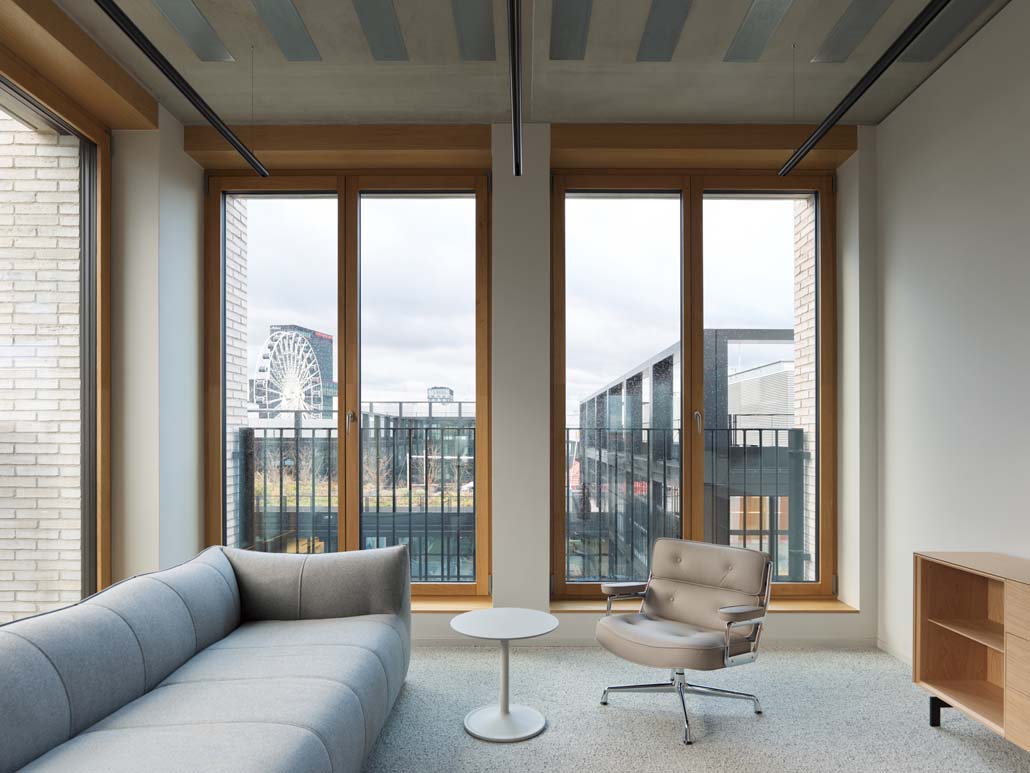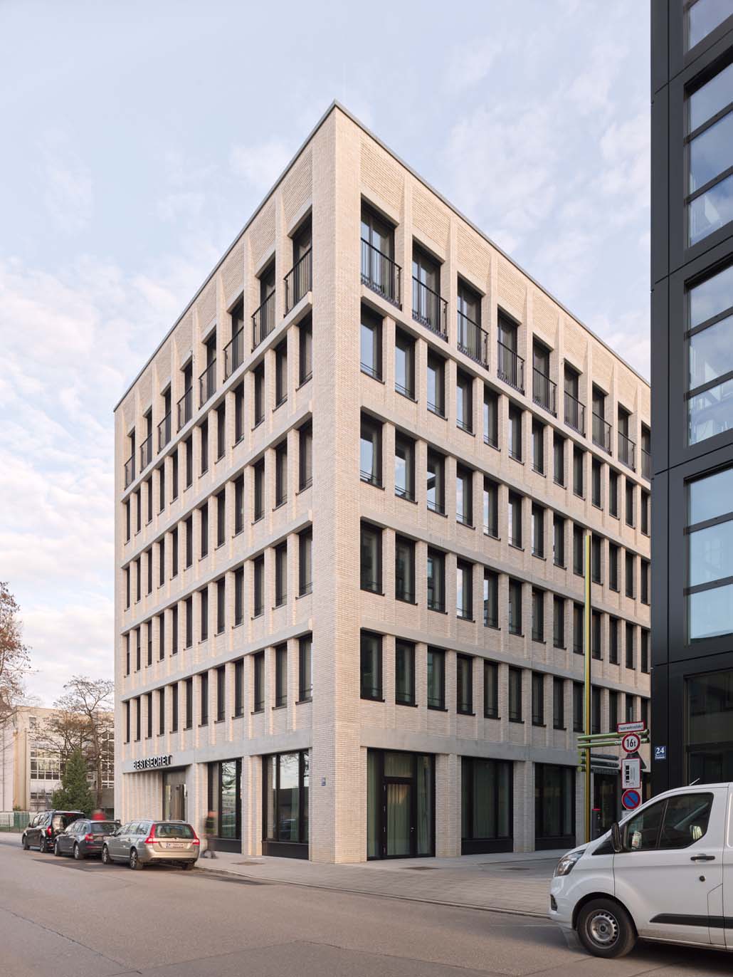 Die Fassadengliederung folgt einem präzisen 1,5-Meter-Raster, das sich im Inneren fortsetzt und flexible Bürogrundrisse erlaubt – von Einzel- bis Multispace-Büros. Raumhöhen zwischen drei und vier Metern sorgen für Großzügigkeit. Der markant zurückgestaffelte Eingangsbereich öffnet sich zu einer hellen, klar organisierten Lobby mit zentralem Erschließungskern.