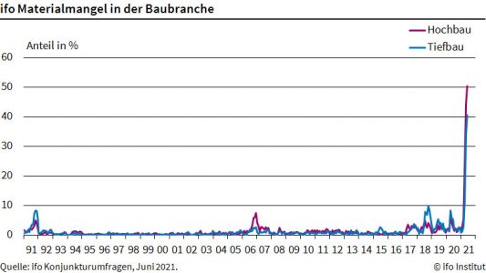Im Hochbau meldeten zudem 50,4 Prozent der Betriebe Beeinträchtigungen durch Lieferverzögerungen. Im Mai waren es 43,9 Prozent und im April 23,9 Prozent. Im Tiefbau berichteten im Juni 40,5 Prozent der Befragten von Problemen bei der Beschaffung. Das entspricht einem spürbaren Anstieg gegenüber dem Vormonat, als es 33,5 Prozent waren. Noch im März war im Tiefbau mit 2,9 Prozent kaum von Lieferproblemen die Rede.