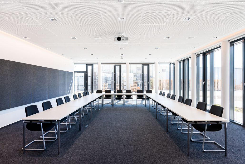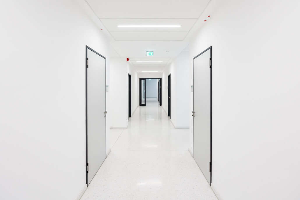 Das Bauteil B, das sich nach Süden hin orientiert, nimmt im Erdgeschoss die übergeordneten und öffentlichen Bereiche wie das Besprechungszentrum auf. Im rückwärtigen Bereich befinden sich Personalumkleiden, Pausen- und Lagerräume. Die darüber liegenden Geschosse zeichnen sich größtenteils durch eine ähnliche Aufteilung aus. Während sich die Labore, Büros und Auswerteräume an den Fassadenseiten befinden und auf diese Weise bestmöglich mit Tageslicht versorgt werden, wurden die zum Betrieb der Labore notwendigen Nebenräume und technischen Anlagen in den Mittelzonen angeordnet. Zentral angeordnete Kreativ- und Pausenräume werden teamübergreifend genutzt und fördern die Kommunikation und den Austausch. 116 Laborarbeitsplätze sowie 44 Büroarbeitsplätze verteilen sich so auf einer Nutzfläche von rund 5.600 qm.