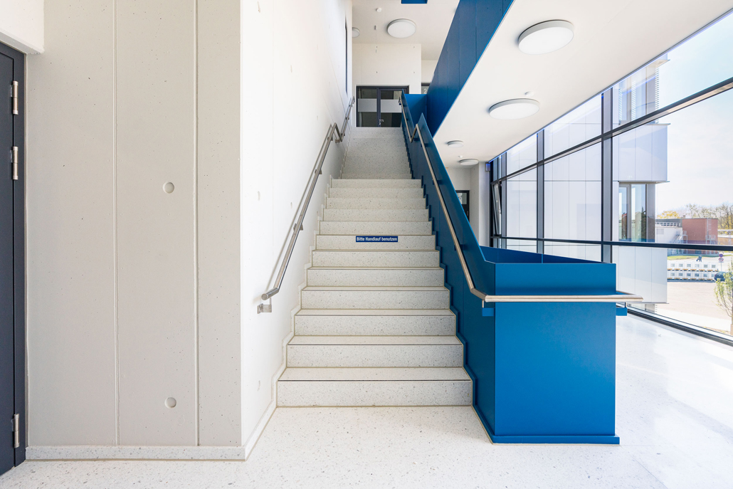 Im neuen Laborgebäude wird neben Forschungsarbeiten an Auto- und Reparaturlacken ebenfalls an neuen Anwendungsmöglichkeiten in der Oberflächenbeschichtung geforscht. Für effiziente Arbeitsabläufe, bei denen sowohl der interdisziplinäre Austausch zwischen den Forscherteams als auch Rückzugsmöglichkeiten für konzentriertes Arbeiten Berücksichtigung finden, sorgt eine flexible Grundrissgestaltung. Diese sichert ferner eine mögliche Umnutzung sowie Erweiterbarkeit des Gebäudes. Besucher und Mitarbeiter betreten den Neubau über den vollständig verglasten Verbindungsbaukörper. Der eingestellte Treppenraum zieht sich an dieser Stelle als „blauer Faden“ durch das gesamte Gebäude und ermöglicht die Erschließung aller Bereiche. Ferner sichert ein ebenfalls im Verbindungsbaukörper angeordneter Aufzug die barrierefreie Erschließung.