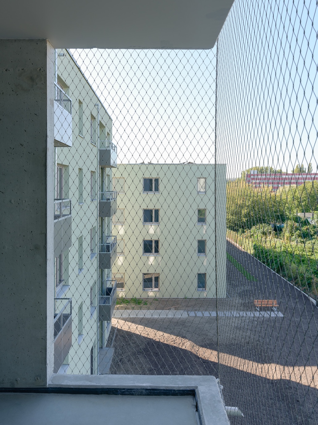 Der Grundgedanke des Ensembles beruht auf dem sozialem Miteinander. Der vielfältige Mix zwischen gewerblicher Nutzung mit Büros, Gemeinschaftsflächen und lichtdurchfluteten Wohnungen mit ein bis sechs Zimmern trägt zu einem lebendigen Quartier bei. 62 Prozent der Wohnungen sind bei diesem „Lückenschluss“-Projekt öffentlich gefördert. Hier zeigt sich eindrucksvoll, wie bezahlbarer Wohnungsbau im urbanen Raum, ökologische Verantwortung und hohe Aufenthaltsqualität für die Bewohnerinnen und Bewohner miteinander verschmelzen können.