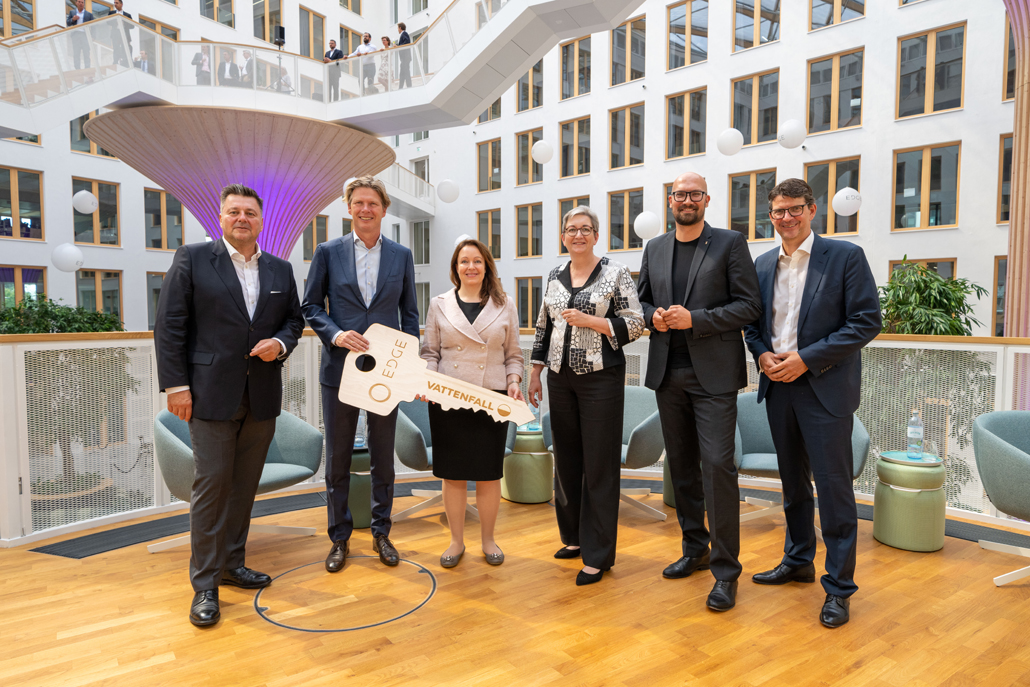 v.l.n.r. Andreas Geisel, Senator für Stadtentwicklung, Bauen und Wohnen Berlin; Coen van Oostrom, EDGE CEO; Anna Borg, Vattenfall CEO; Klara Geywitz, Bundesministerin für Wohnen, Stadtentwicklung und Bauwesen; Michael Biel, Staatssekretär für die Senatsverwaltung für Wirtschaft, Energie und Betriebe Berlin; Christian Barthélémy, Vattenfall Deutschland-Chef (c) Vattenfall