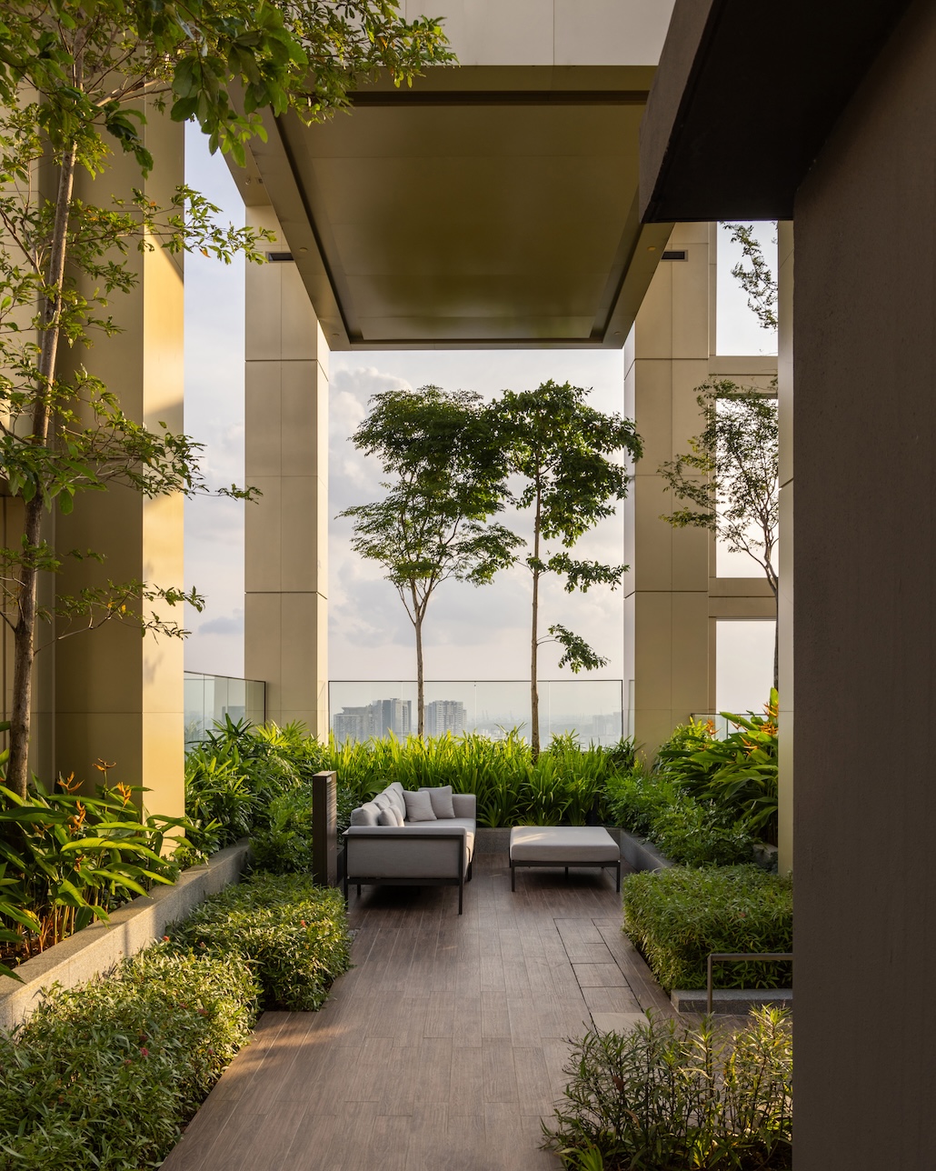 Das pixelierte Muster betont zugleich die gemeinschaftlichen Bereiche des Gebäudes mit ihrer für Singapur typischen üppigen Begrünung. Im 24. Obergeschoss befindet sich ein etwa vier Geschosse hoher Sky Garden; auf den Dächern der Türme liegt „Irwell Sky“, ein intimer Ort für soziale Zusammenkünfte. In beiden Bereichen löst sich das starre Raster der Einzelpixel auf: Doppel- und Dreifachrahmen geben den Blick auf die darin integrierten Bäume und Pflanzen frei.