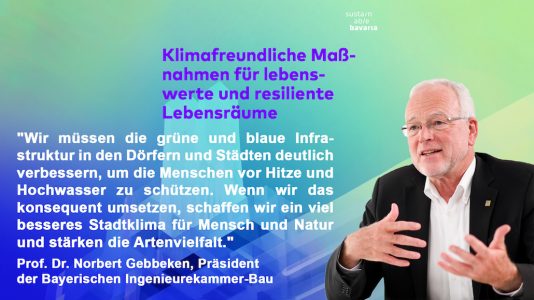 Lebenswerte und resiliente Lebensräume können nur entstehen und erhalten werden, wenn die natürlichen Ressourcen geschont werden. „Wir müssen endlich davon wegkommen, regelmäßig Neubaugebiete auszuweisen. Vielerorts sehen wir Leerstände in den Ortskernen, während am Stadtrand neue Flächen versiegelt werden. Das ist aus mehreren Gründen unklug“, sagt Prof. Dr. Norbert Gebbeken, Präsident der Bayerischen Ingenieurekammer-Bau und Initiator des Bündnisses ‚Sustainable Bavaria‘.