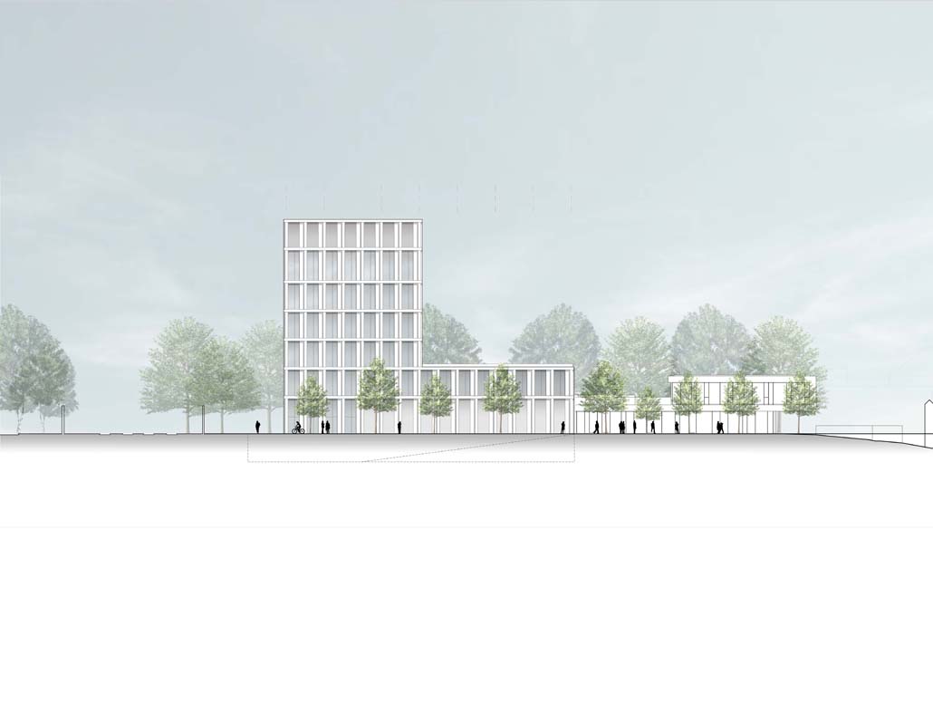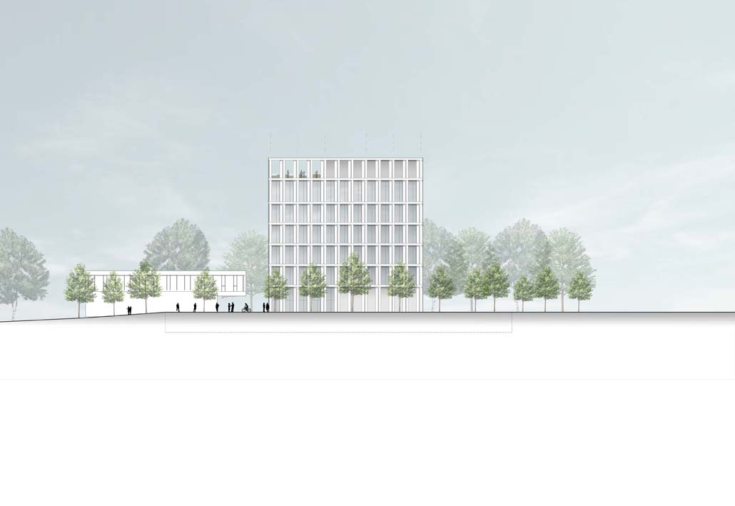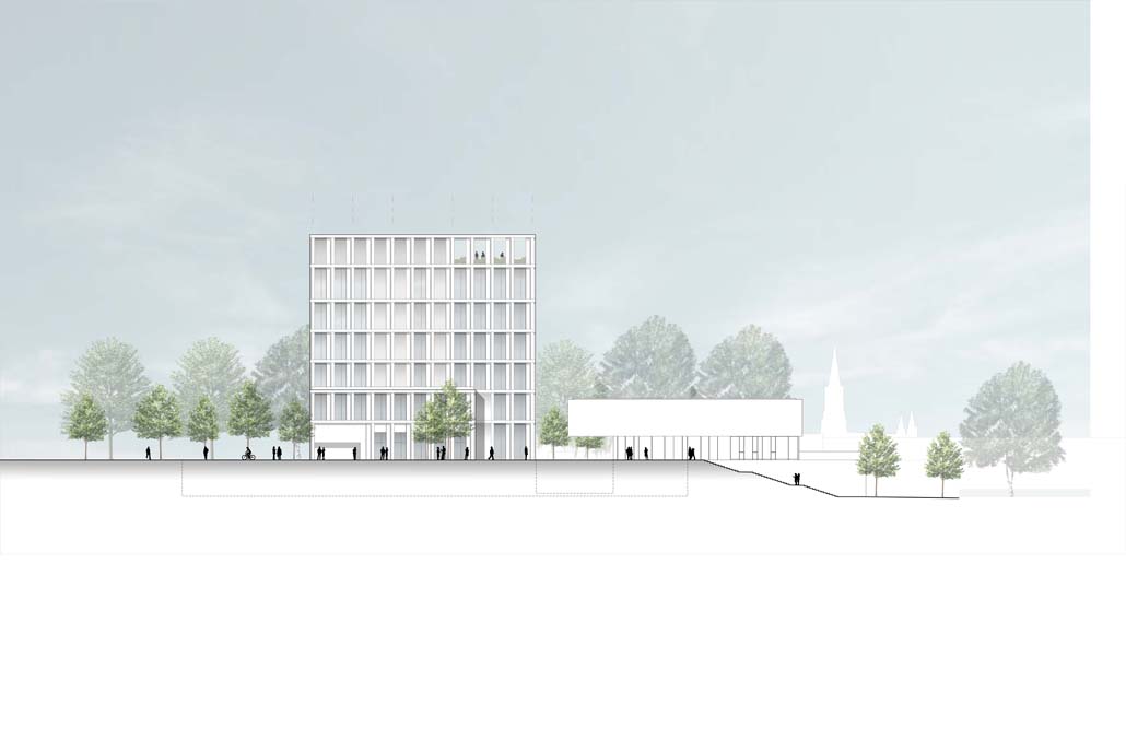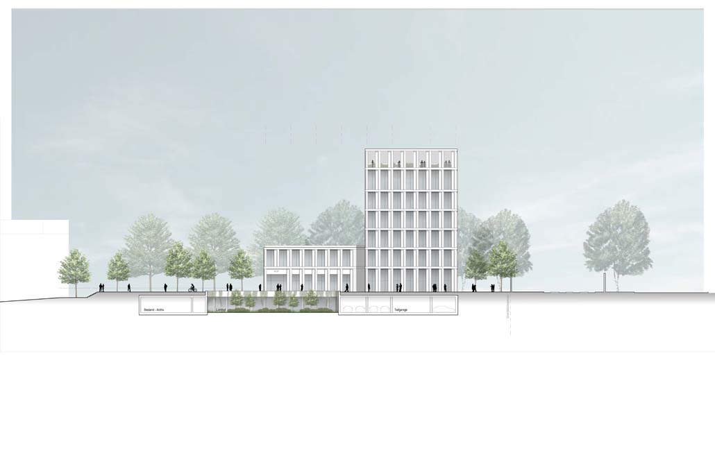 • Sechsgeschossiger Neubau als neuer städtebaulicher Hochpunkt