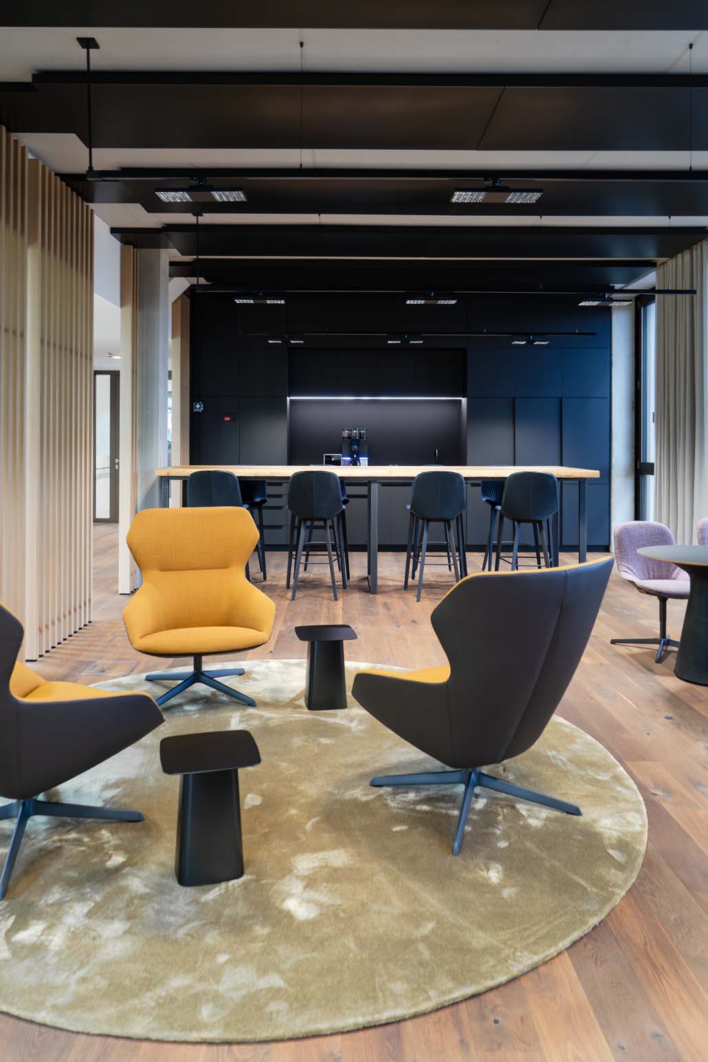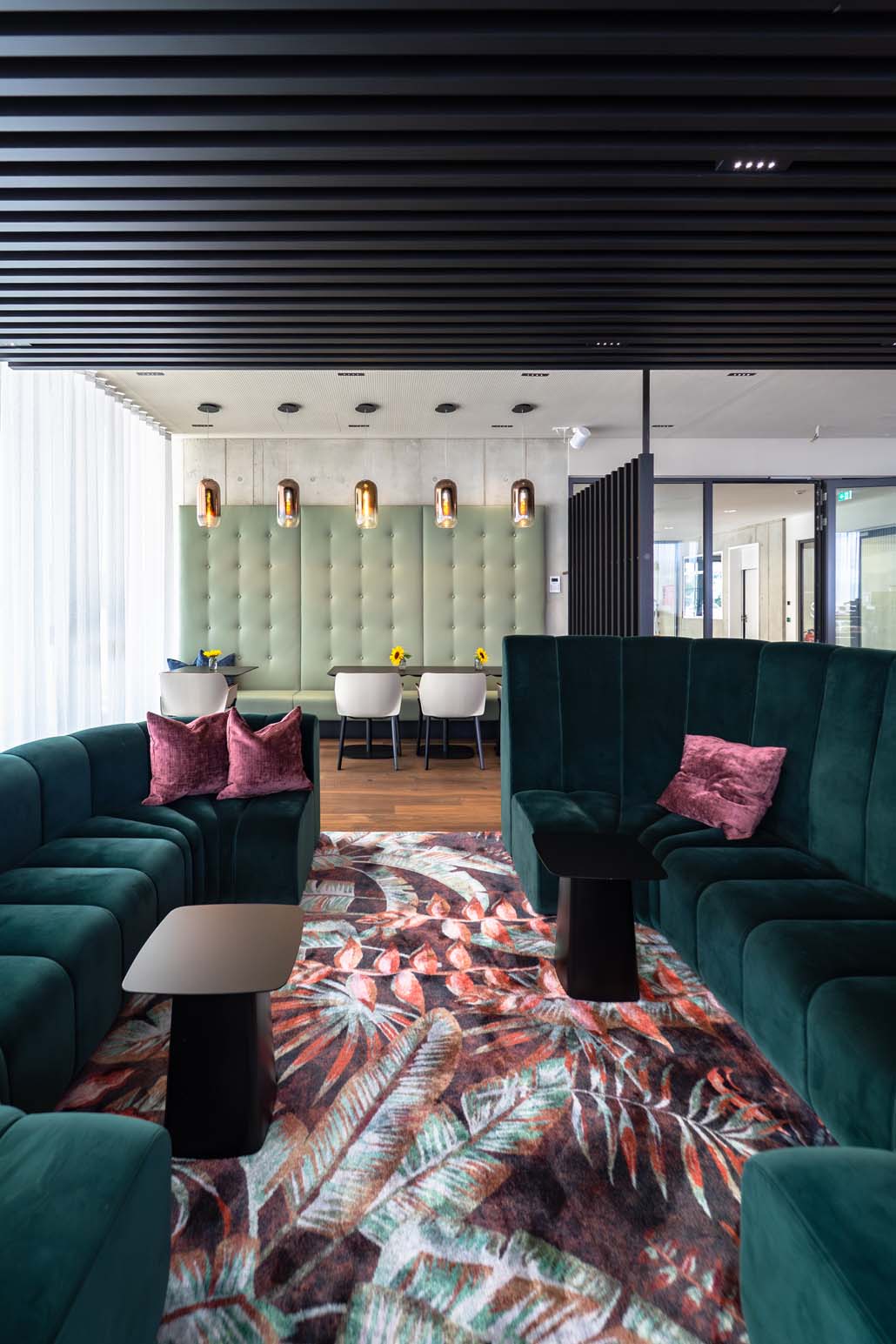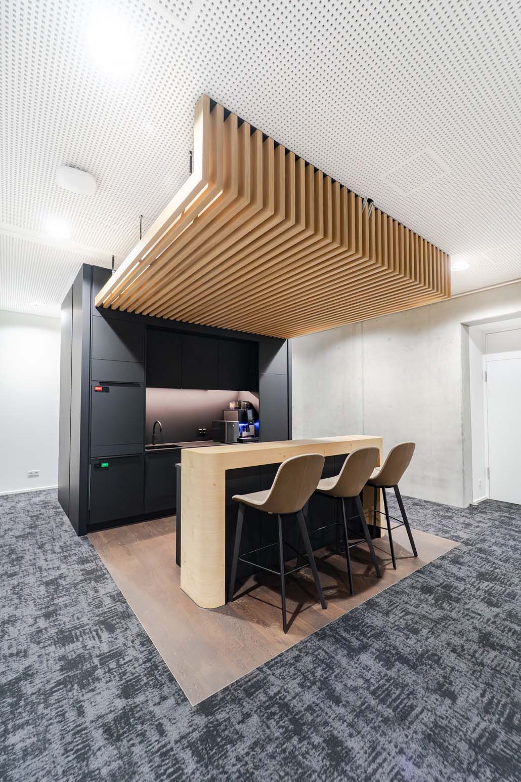 Dabei verbindet sich die kontrastreiche Architektur in der neuen Arbeitswelt zu einer gemeinsamen gestalterischen Sprache: Strenge trifft auf Wärme, Präzision entfaltet Atmosphäre. Im Bestand bleiben die rohen Sichtbetonflächen bewusst erhalten – als authentischer Hintergrund für eine fein abgestimmte Material- und Farbwelt. Hochwertige, mattschwarze Oberflächen bei Möbeln und Glasprofilen betonen den klaren Charakter. Einzelbüros mit großzügiger Innenverglasung schaffen Transparenz und Diskretion zugleich, ergänzt durch offene Gruppenarbeitszonen mit akustischen Maßnahmen. Die Rückzugs- und Aufenthaltsbereiche setzen dagegen bewusste Kontraste: Farbintensiv, mit hochflorigen Teppichen gestaltet, setzen die Architekten von Nething auf eine wohnliche Atmosphäre. Die Espressobar im Bestand, bekannt für den „besten Kaffee in Ulm“, trennt den Raum in mehrere loungige Bereiche. Eine Break-Out Area mit Dart und großem Bildschirm für Sportübertragungen lädt zum Verweilen ein. Die angrenzende, intensiv begrünte Dachterrasse mit Grillplatz erweitert die Fläche für die gemeinschaftliche Nutzung im Außenbereich.