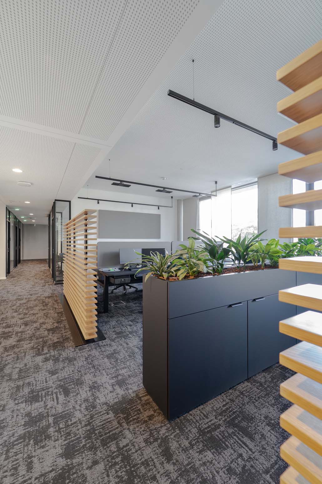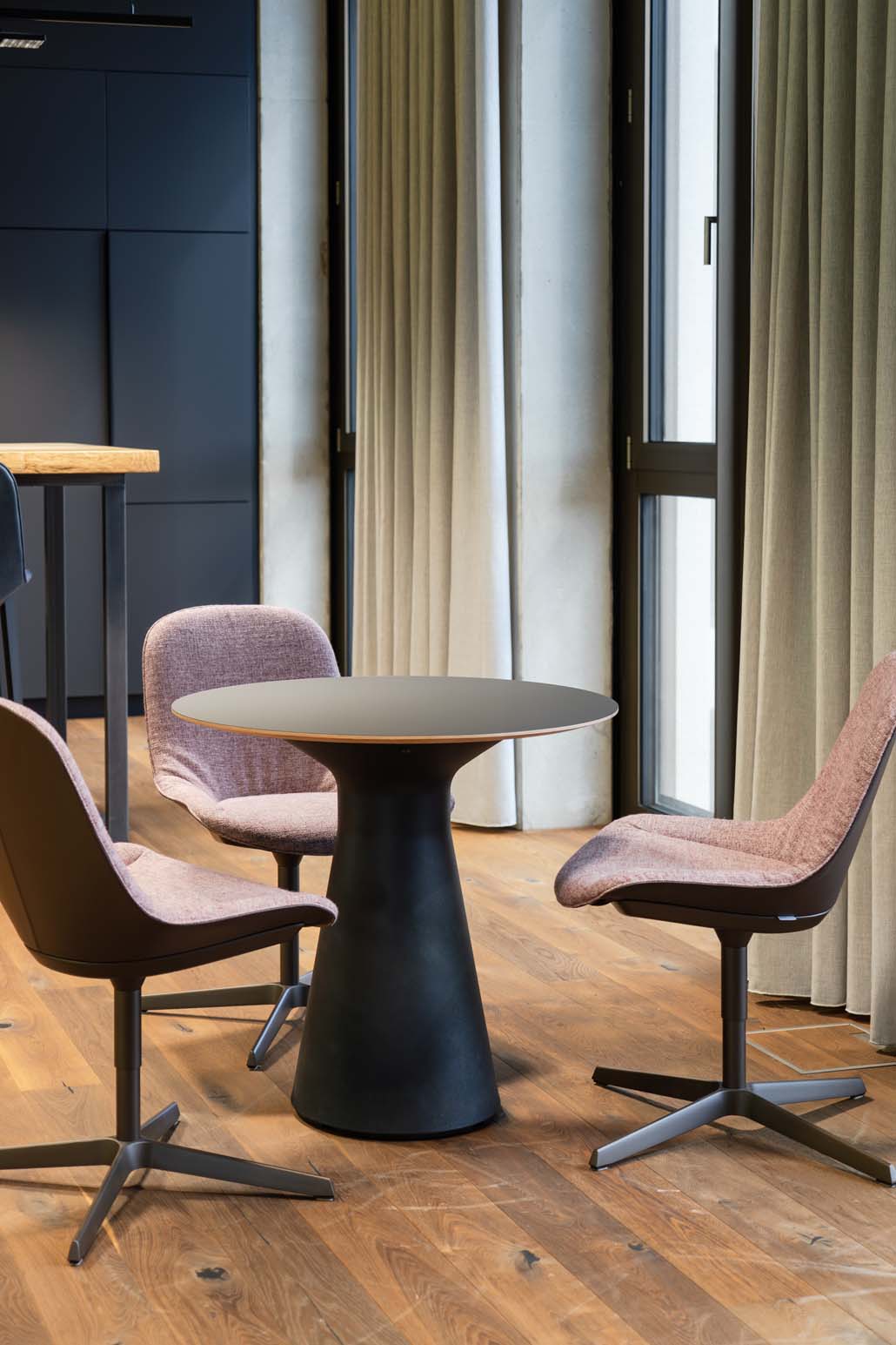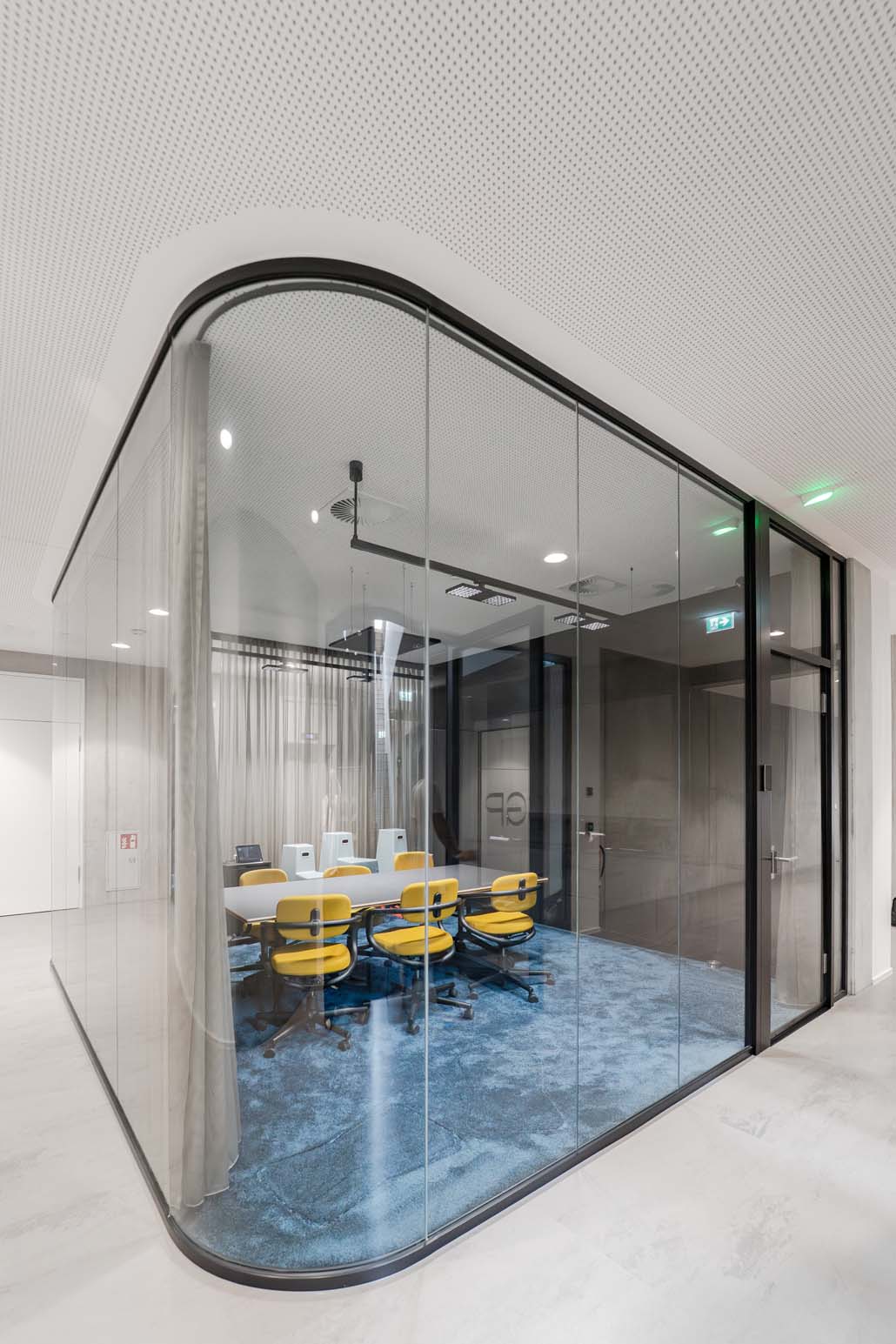 Dabei verbindet sich die kontrastreiche Architektur in der neuen Arbeitswelt zu einer gemeinsamen gestalterischen Sprache: Strenge trifft auf Wärme, Präzision entfaltet Atmosphäre. Im Bestand bleiben die rohen Sichtbetonflächen bewusst erhalten – als authentischer Hintergrund für eine fein abgestimmte Material- und Farbwelt. Hochwertige, mattschwarze Oberflächen bei Möbeln und Glasprofilen betonen den klaren Charakter. Einzelbüros mit großzügiger Innenverglasung schaffen Transparenz und Diskretion zugleich, ergänzt durch offene Gruppenarbeitszonen mit akustischen Maßnahmen. Die Rückzugs- und Aufenthaltsbereiche setzen dagegen bewusste Kontraste: Farbintensiv, mit hochflorigen Teppichen gestaltet, setzen die Architekten von Nething auf eine wohnliche Atmosphäre. Die Espressobar im Bestand, bekannt für den „besten Kaffee in Ulm“, trennt den Raum in mehrere loungige Bereiche. Eine Break-Out Area mit Dart und großem Bildschirm für Sportübertragungen lädt zum Verweilen ein. Die angrenzende, intensiv begrünte Dachterrasse mit Grillplatz erweitert die Fläche für die gemeinschaftliche Nutzung im Außenbereich.