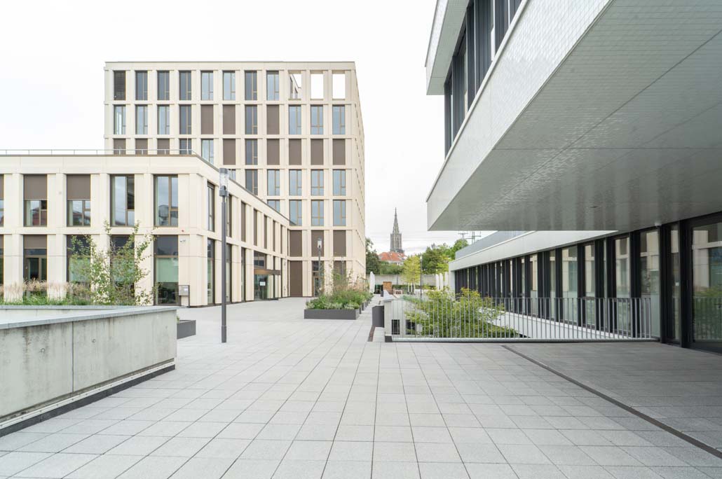 Der Neubau markiert einen bewusst gesetzten Hochpunkt, der die Sichtbeziehungen Ulms neu akzentuiert. Von der Donau und der Neu-Ulmer Seite erscheint er als Teil der Uferlandschaft, von der Innenstadt aus zitiert er in abstrahierter Form die gotische Vertikalität des Ulmer Münsters, aus der Bahnlinie tritt er als markantes Zeichen im infrastrukturellen Kontext hervor. Durch die versetzte Anordnung der beiden Baukörper entsteht ein halböffentlicher Platz, der als klares Signal gegen die Abgeschlossenheit gilt, die Kanzleibauten oft prägt. „Transparenz nach außen, ohne Vertraulichkeit im Inneren aufzugeben – dieser Balanceakt macht den Campus zu einem Modell für die räumliche Verortung einer neuen Arbeitskultur, die städtische Verantwortung, Gemeinschaft und Identität verbindet“, erläutert Vilja Bäumann von Nething Architekten. Auch heute führen Wege und Freiflächen bis an die Gebäudekanten und öffnen das Ensemble für Spaziergänger und Besucher. Mit einem in den Abendstunden bewusst auch für die Öffentlichkeit zugänglichen Restaurant und einem Fitnessstudio spricht Schneider Geiwitz gezielt eine Einladung an die Bevölkerung aus, das neue Wahrzeichen der Stadt für sich zu entdecken.