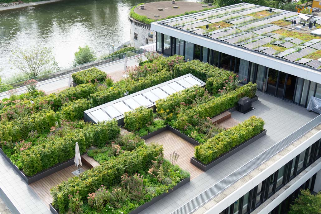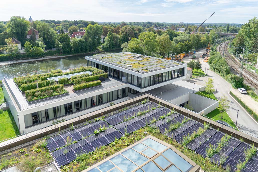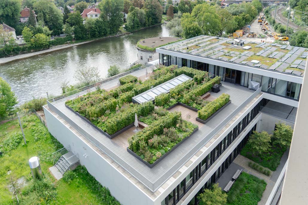 Mit dem Bekenntnis zum kontextuellen Weiterbauen des Bestands betonte die Kanzlei Schneider Geiwitz schon früh, dass Nachhaltigkeit mehr ist als Technik: Sie bedeutet auch Ressourcenschonung, Flächenvermeidung und die Fortschreibung eines Ortes mit Geschichte. Lange vor den aktuellen Debatten legte die Kanzlei fest, unabhängig von fossilen Energien zu werden. Technisch setzt der Campus auf ein kombiniertes System aus Erdsonden, Wärmepumpen und Photovoltaik. Bis zu 60 Meter tief reichen die Sonden – ein Novum für Ulm, das zunächst Überzeugungsarbeit bei den Behörden erforderte. Im Winter liefern sie Wärme und im Sommer kühlen sie. Photovoltaikanlagen auf allen Dachflächen – Bestand wie Neubau – decken nicht nur den Eigenbedarf, sondern versorgen auch Ladesäulen für Elektromobilität. Ergänzend bleibt der Fernwärmeanschluss als „Bypass“ erhalten, um langfristige Versorgungssicherheit zu gewährleisten. So entsteht eine nahezu CO₂-neutrale Energieversorgung – ein Modellprojekt für Ulm.