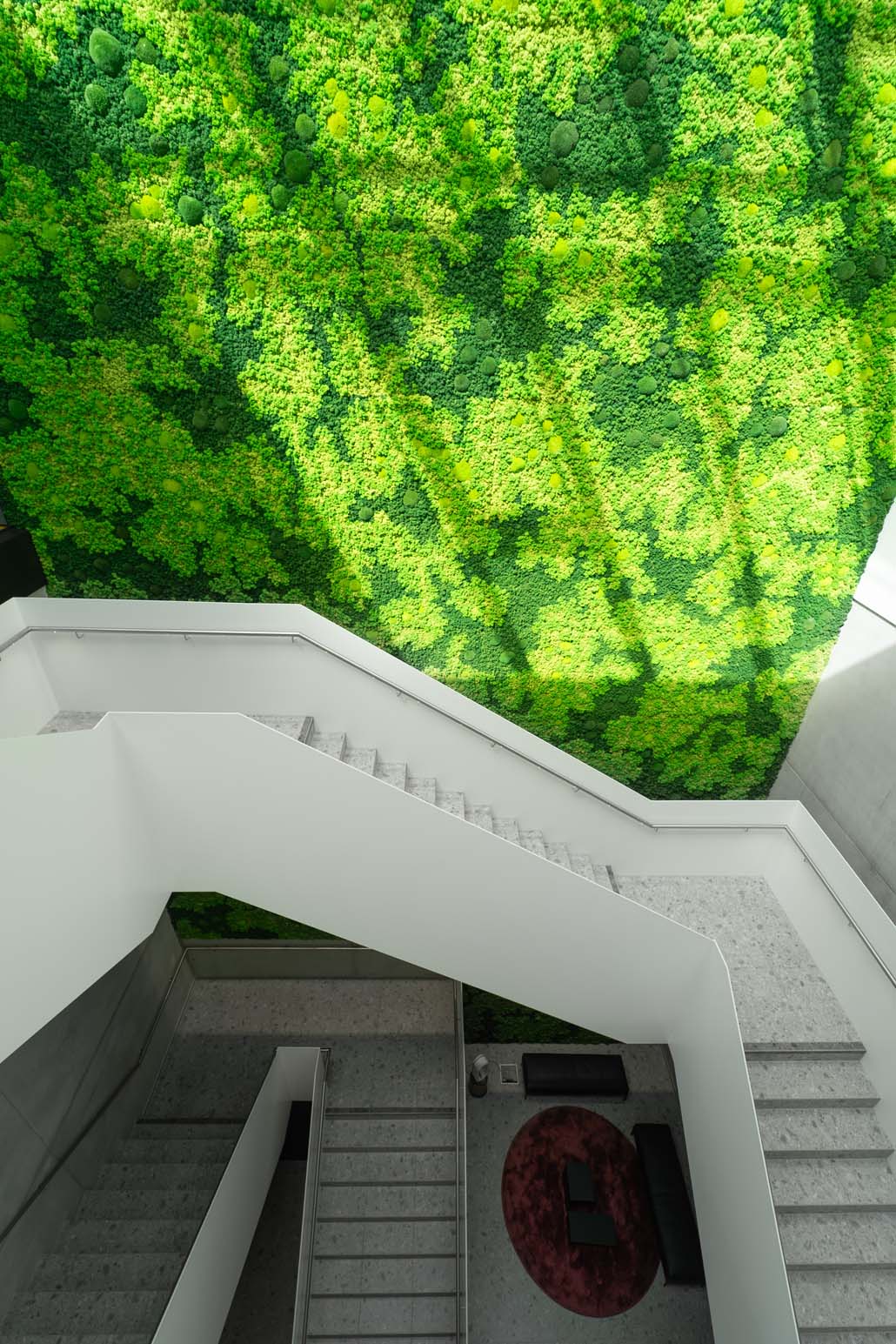 Das großzügige Foyer im Neubau bildet das zentrale Gelenk der Gebäude. Die von Tageslicht geflutete Freitreppe unter Glas führt über drei Geschosse und inszeniert Übergänge und Begegnungen – für Besucher und Mitarbeitende. Die Empfangshalle selbst ist ein Raum von fast musealer Klarheit, der Kunst, Architektur und Handwerk miteinander verschränkt. Eine großformatige Fotokunst von Michael Najjar, die sich dem Spannungsfeld von Wissenschaft, Technologie und Raumfahrt widmet, entfaltet ihre Wirkung auf einer bewusst freigehaltenen Wandfläche. Ein skulpturales Empfangsmöbel lässt den Dialog zwischen Bestand und Erneuerung auch im Inneren lebendig werden: Organisch geformt, aus Holz gefräst, erinnert es an das schützende Blätterdach eines Baumes, weckt aber auch die Assoziation an ein futuristisches Raumschiff. Auch eine üppige Mooswand entlang der Freitreppe greift die Natur auf und sorgt für eine Verortung des Neubaus im Gelände. Eine über der Theke schwebende, elliptische Struktur symbolisiert Planetenbahnen, die runde Form steht für die Erde. Das Objekt vereint Wärme und Innovation und wird zum architektonischen Signum des Campus.
