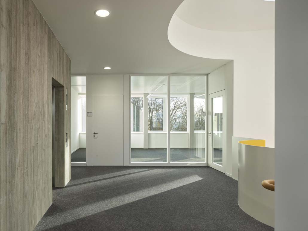 Das Foyer öffnet sich zu einem öffentlichen Bereich, der flexibel nutzbar ist – etwa für Veranstaltungen, Empfänge oder kleine Gruppenformate. Im Zentrum des Gebäudes befindet sich ein massiver Sichtbetonkern mit Holztüren, der in Kontrast zu den hellen Wandflächen und verglasten Flurwänden steht.