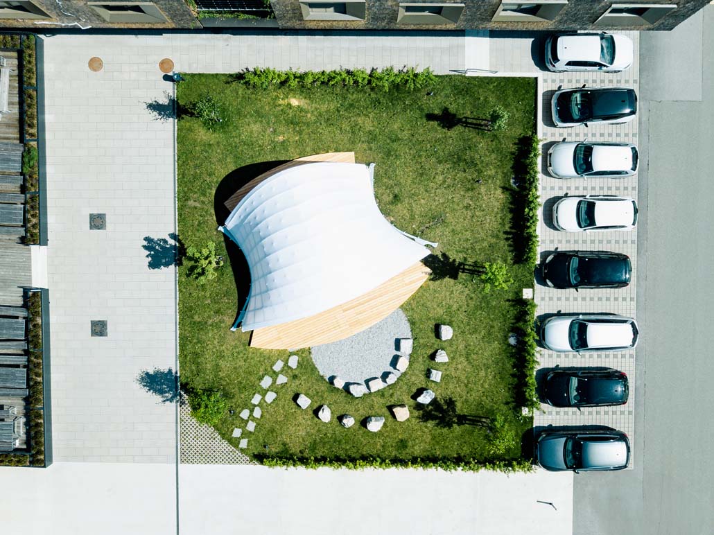 Was passiert aber, wenn die Holzstäbe nicht parallel sind? Dann müssen sie beim Aufspannen in die dritte Dimension ausweichen und ergeben eine gewölbte Form. „Man baut die Struktur einfach zweidimensional zusammen, ohne dass dabei irgendwelche Biegespannungen auftreten. Erst wenn die Struktur aufgespannt wird, biegen sich die Holzstäbe zur gewünschten, gewölbten Form“, sagt Stefan Pillwein.