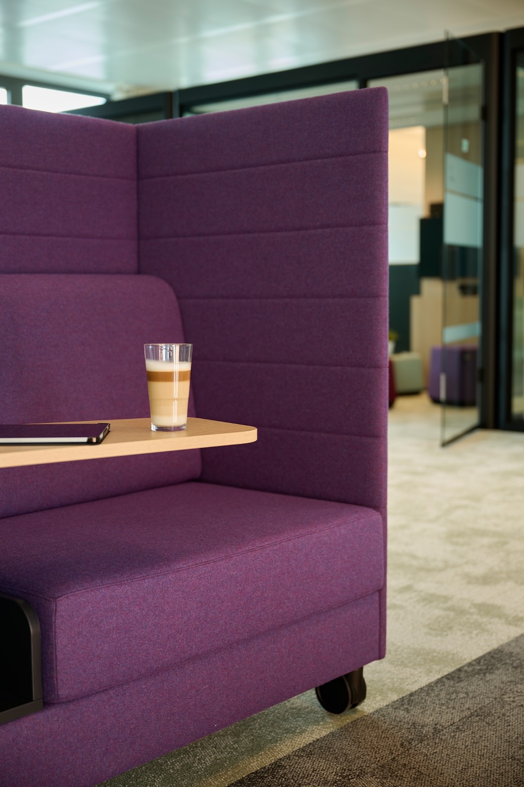 - 64 „Lila Wolken“ – so nennt die Sparkasse liebevoll das Loungemöbel Atelier – bieten in einer besonders warmen Farbgebung im gesamten Gebäude gemütliche Sitzgelegenheiten für spontane Treffen oder Sitzpausen.