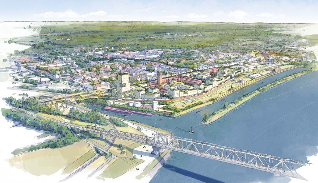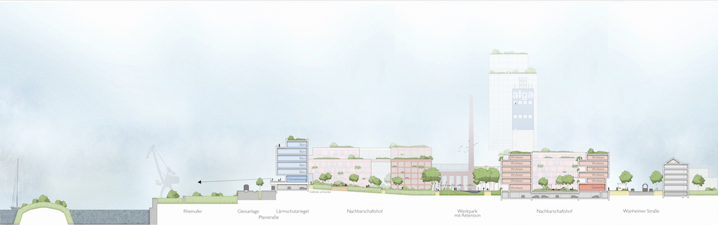Im Zentrum des Entwurfs steht die Idee, das zuvor abgeschlossene Industriegelände zu einem offenen und durchlässigen Quartier zu entwickeln. Die bisher trennende Wanheimer Straße soll städtebaulich eingebunden und der öffentliche Zugang zum Rhein durch neue autofreie Werksgassen ermöglicht werden. Diese greifen das bestehende Straßen- und Wegenetz von Wanheimerort auf und führen es über das Areal bis ans Rheinufer. Geplant sind zudem eine Rheinterrasse mit weitem Ausblick sowie neue Brücken, die das Quartier mit benachbarten Freiräumen und der Rheinpromenade verbinden.