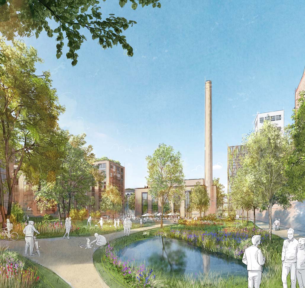 Ein besonderer Fokus des Projekts liegt auf der Schaffung großzügiger Grün- und Aufenthaltsflächen im Inneren des Quartiers. Der neue Werkpark wird als gemeinschaftlicher Freiraum gestaltet und schützt durch seine Lage vor Lärm. Flächen, die zuvor industriell versiegelt waren, sollen künftig für Freizeit, Spiel, Erholung und Wasserrückhaltung genutzt werden und orientieren sich am Prinzip der Schwammstadt. Das bauliche Konzept sieht vor, zahlreiche Bestandsgebäude zu erhalten und die Transformation schrittweise und flexibel zu gestalten, sodass der Umbau unabhängig vom Bestand in Bauabschnitten realisiert werden kann.