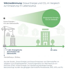 Die untersuchten Dämmstoffe sparen in ihrer Nutzungsphase – in der Studie 40 Jahre, doch in der Praxis meist auch länger – ein Vielfaches mehr an CO2 und Energie ein, als bei ihrer Herstellung emittiert bzw. benötigt wird. In der Regel amortisieren sich „Graue Energie“ und „Graue Emissionen“ innerhalb weniger Monate. Somit lässt sich ableiten, dass die Graue Energie der Dämmung bei den Modernisierungsmaßnahmen und der Ökobilanz des Gebäudes vernachlässigbar gering ist.