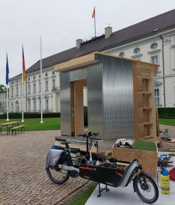 Der Demonstrator für das Holz-Hochhaus ist knapp vier Meter hoch und sieben Tonnen schwer. Für zwei Tage ist er am 4. und 5. Juni bei einer Innovationsschau bei der „Woche der Umwelt“ im Garten des Schlosses Bellevue zu sehen. Der „Woodscraper“ soll in Kürze tatsächlich realisiert werden. Er zeigt exemplarisch, was beim nachhaltigen Bauen mit Holz und anderen Naturstoffen möglich ist.