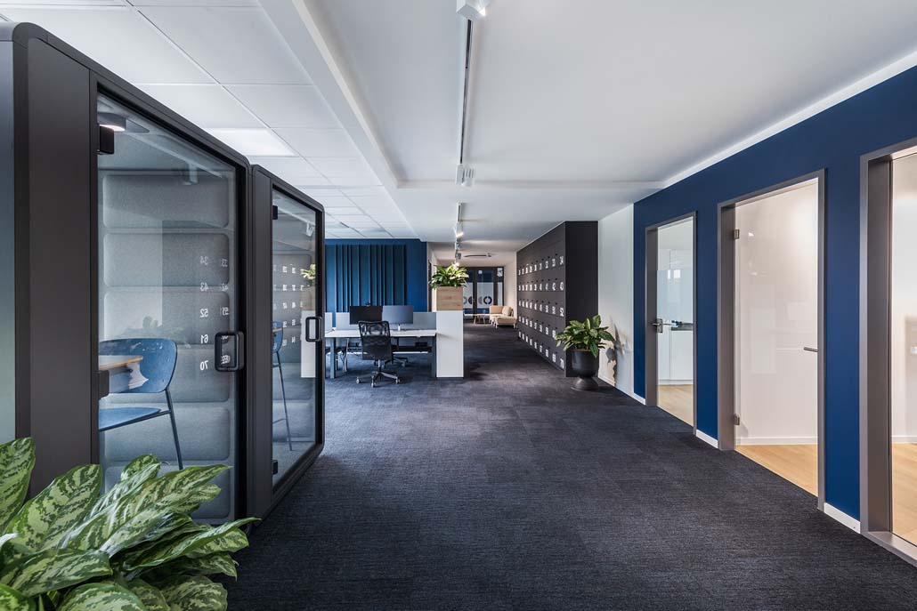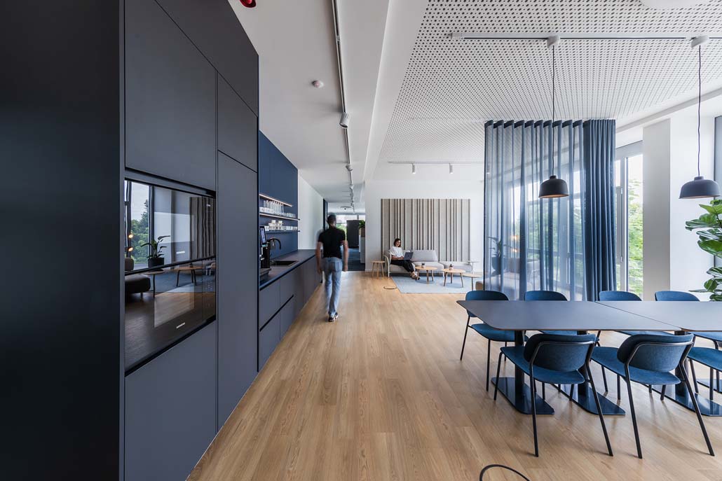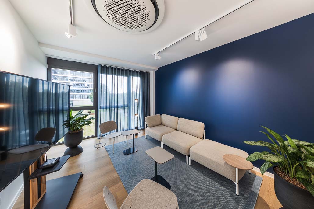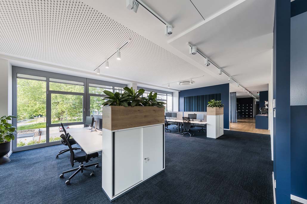 Die neugestaltete Flächenstruktur bietet rund 66 Arbeitsplätze in Form von offenen Kollaborationszonen, Rückzugsbereichen, hybriden Meetingzonen sowie einem zentralen WorkCafé. Die Mischung aus offenem Raum, Rückzugsmöglichkeiten und multifunktionalen Projektflächen schafft eine Arbeitsumgebung, die den unterschiedlichen Anforderungen im Projektalltag, im Tagesgeschäft oder in übergreifender Abstimmung gerecht wird.