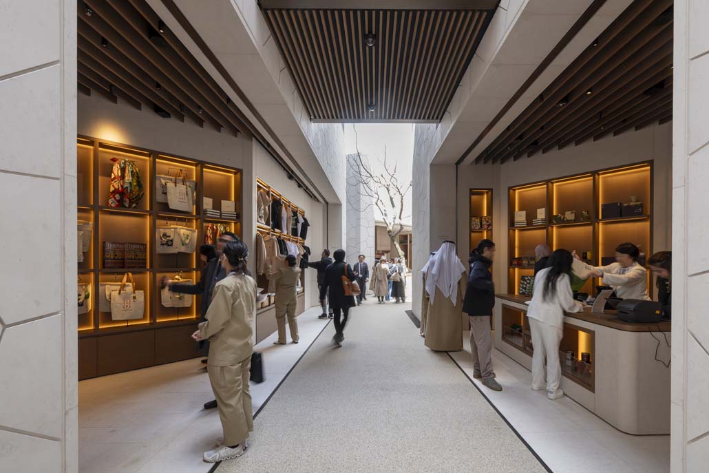 Die Besucher betreten den Pavillon über den Vorplatz, der mit einheimischer saudi-arabischer Flora bepflanzt ist, und gehen durch enge Gassen, die zum saudischen Innenhof führen, dem Herzstück des Projekts. Der Hof bietet tagsüber Raum für ruhige Momente der Besinnung und verwandelt sich nachts in einen Ort für Aufführungen und Veranstaltungen. Von hier aus sind die Besucher eingeladen, ein „Dorf“ aus sich schlängelnden Straßen zu erkunden, mit Fenstern und Türen zu einer Reihe von immersiven Räumen, die in enger Zusammenarbeit mit Journey (59 Productions und Squint/Opera) entworfen wurden. Das Projekt würdigt das architektonische Erbe Saudi-Arabiens, weckt ein Gefühl für den Ort und bietet den Besuchern einen Einblick in das tägliche Leben und das urbane Gefüge auf den Straßen des Königreichs.