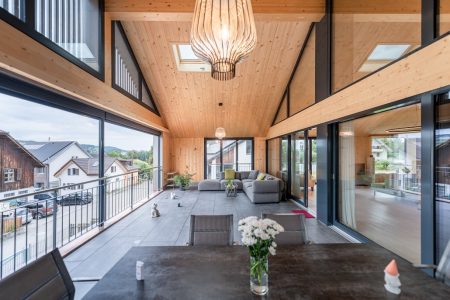 Nachdem die Entscheidung gefallen war, ging alles sehr schnell. Erika Rüttimann und Anton Albisser übernahmen die Skizzierung selbst, alle Räumlichkeiten wurden den eigenen Bedürfnissen entsprechend optimal aufeinander abgestimmt. Anschließend wurde die Skizzierung an den Architekten für die Erstellung der Pläne und der Baueingabe übergeben. Nach der Erteilung der Baubewilligung übernahm Anton Albisser die Bauleitung wieder selbst. Ein Schlüsselfaktor für die hohe Wohnqualität ist die beeindruckende Raumhöhe von bis zu sechs Metern im Giebel. Darüber hinaus wurden zahlreiche individuelle Wünsche realisiert. „Dazu zählen das Lesefenster in der gemütlichen Leseecke, die seitliche Verglasung der großzügigen Loggia sowie die Dachfenster in diesem Bereich, um die Abluft des Barbecue-Grills zu gewährleisten“, so die Bauleute. Darüber hinaus punktet das Haus durch eine Reihe weiterer, auf die Auftraggeber abgestimmten Details, wie beispielsweise 2,40 m hohe Türen, spezielle, maßgeschneiderte Duschwände von Artweger, zusätzliche Dachfenster in den Duschen, innenwandbündig installierte Fenster und sowie ein durchgängiges Farbkonzept bei Fenstern, Türen, Küche und Sockelleisten. Die konstruktive als auch gestalterische Hauptrolle spielt jedoch eindeutig das Naturmaterial Holz – in diesem Fall die leim- und metallfrei produzierten Vollholz-Elemente des Südtiroler Holzbauspezialisten holzius.