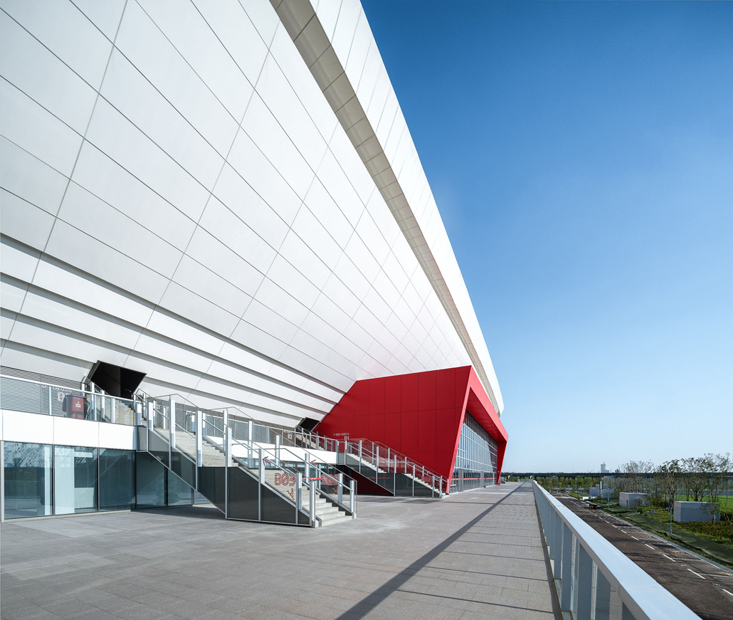 Die Form des Stadions hat HPP in Anlehnung an eine Schale aus traditionellem chinesischem Porzellan entworfen. Die kompakte Erscheinung der flachen Geometrie wird durch die plane, weiß schimmernde Metallfassade und die gewölbte Gebäudehülle unterstützt. Durch die minimalistische Architektursprache fügt sich das Stadion sanft in die urbane und zugleich landschaftlich geprägte Umgebung ein und lenkt den Fokus bewusst auf Nutzung und Interaktion.
