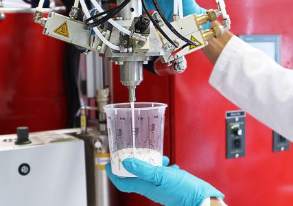 Um auch große Mengen an Dämmmaterial für industrielle Anwendungen herstellen zu können, werden am Fraunhofer ICT Verfahren für die Skalierung der Polymersynthese gezielt weiterentwickelt. Zudem werden die Proben einer zerstörungsfreien Prüfung mittels Mikro-Computertomographie unterzogen.