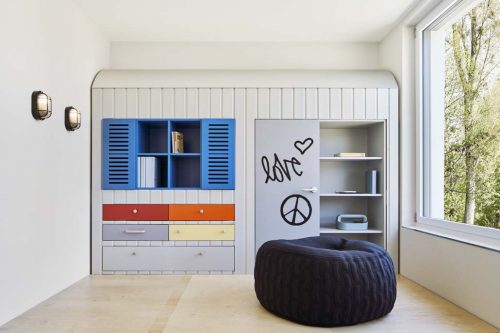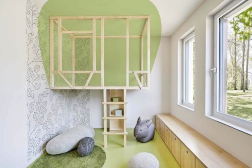 Um die Räumlichkeiten im Sinne ihrer Nutzer:innen zu gestalten, tauschte sich das Architekturbüro im Vorfeld intensiv mit den Ärzt:innen und Mitarbeitenden der Klinik aus, um herauszufinden, welche Bedürfnisse und Arbeitsweisen im fertigen Designkonzept bedacht werden müssen. Die unterschiedlichen Therapie- und Aufenthaltsräume orientieren sich an den individuellen und altersgerechten Bedürfnissen. Zimmer für Kinder zwischen sechs und zwölf Jahren sind als Baumhaus gestaltet; die Baumkrone bietet sich zum Klettern und Zurückziehen an – alle sonstigen Möbel befinden sich kindgerecht auf Augenhöhe. In den Jugendzimmern für Patient:innen zwischen 13 und 17 Jahren sind Rückzugsorte beispielsweise in Form eines Bauwagens designt. Der mit Graffiti bemalte Container bietet nicht nur Stauraum für therapeutische Utensilien, sondern dient auch als Ort der Entspannung auf der hölzernen Veranda davor.
