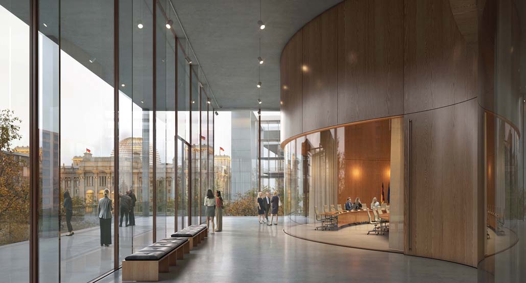 Die Jury unterstrich die besondere Qualität des geplanten Kopfbaus mit seinen großen zweigeschossigen Stadtloggien, die den Ausschusssitzungssälen vorgelagert sein werden. Der Entwurf nimmt sowohl architektonische Prinzipien aus den Bauten des „Band des Bundes“ auf, wie auch die Materialität der historischen Industriebauten. So gelinge eine große architektonische Vermittlungsleistung an einem Ort, der bislang keine eindeutige Prägung hat.