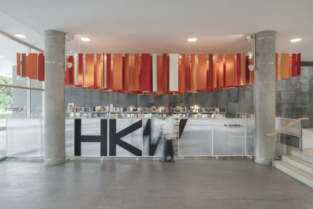 Berlin (pm) – Der neugestaltete Buchladen im Haus der Kulturen der Welt empfängt das Publikum unter einem schwebenden Baldachin in roten Farbnuancen. Er wurde als temporärer Raum mit wiederverwendeten Elementen aus früheren Ausstellungen konzipiert. Als Teil der großen Eingangshalle befindet er sich in einer Art Durchgangsraum, der sich durch minimale Eingriffe in einen Raum der Begegnung verwandelt.