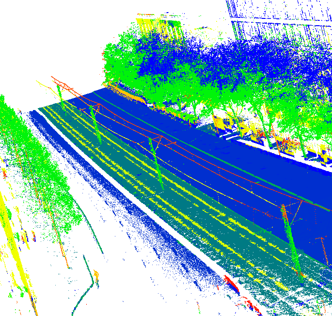 In einem automatisierten Prozess erkennen und klassifizieren spezifisch trainierte KI-basierte Algorithmen typische Objekte des urbanen Umfelds in den Kameradaten. Die Daten sind so genau, dass auch schmale Objekte wie z. B. Zäune, Schilder, Mülleimer oder Bäume erkannt werden. Durch Fusion mit den 3D-Daten der Laserscanner entsteht ein präzises dreidimensionales Abbild der Umgebung, die sogenannte 3D-Punktwolke, in der jeder Punkt eindeutig im Raum verortet ist.