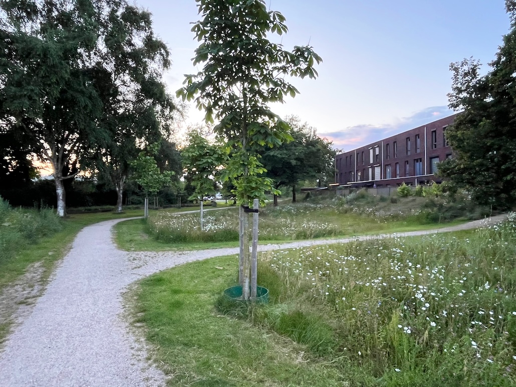 Regenwasser von befestigten Flächen und Häusern wird sichtbar über offene Rinnen in Wadis im Park geleitet. Neben ihrer wichtigen Funktion zur Regenwasserbewirtschaftung steigern diese Wadis die Biodiversität und sorgen für Abkühlung während sommerlicher Hitzewellen. Durch die Modellierung der Topografie mit lokalem Bodenmaterial in einem geschlossenen Bodenhaushalt wird der Park erlebnisreicher: Hügel, Wadis und Böschungen schaffen abwechslungsreiche Blickachsen, Aussichtspunkte und zahlreiche Möglichkeiten für naturnahes Spielen.